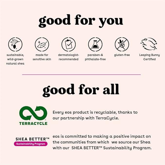 - SUSTAINABLY-SOURCED INGREDIENTS: eos lip balms have wild grown, sustainably sourced, 100% natural shea butter and oil to leave your lips smooth and nourished
