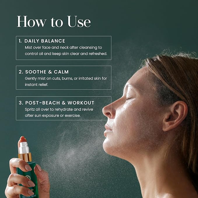 - ๐ฟ Multi-Purpose Toner: Calm, soothe, and hydrate acne-prone and inflamed skin with our versatile Colloidal Silver Mist Toner. Suitable for face, body, and even after waxing to reduce irritations.