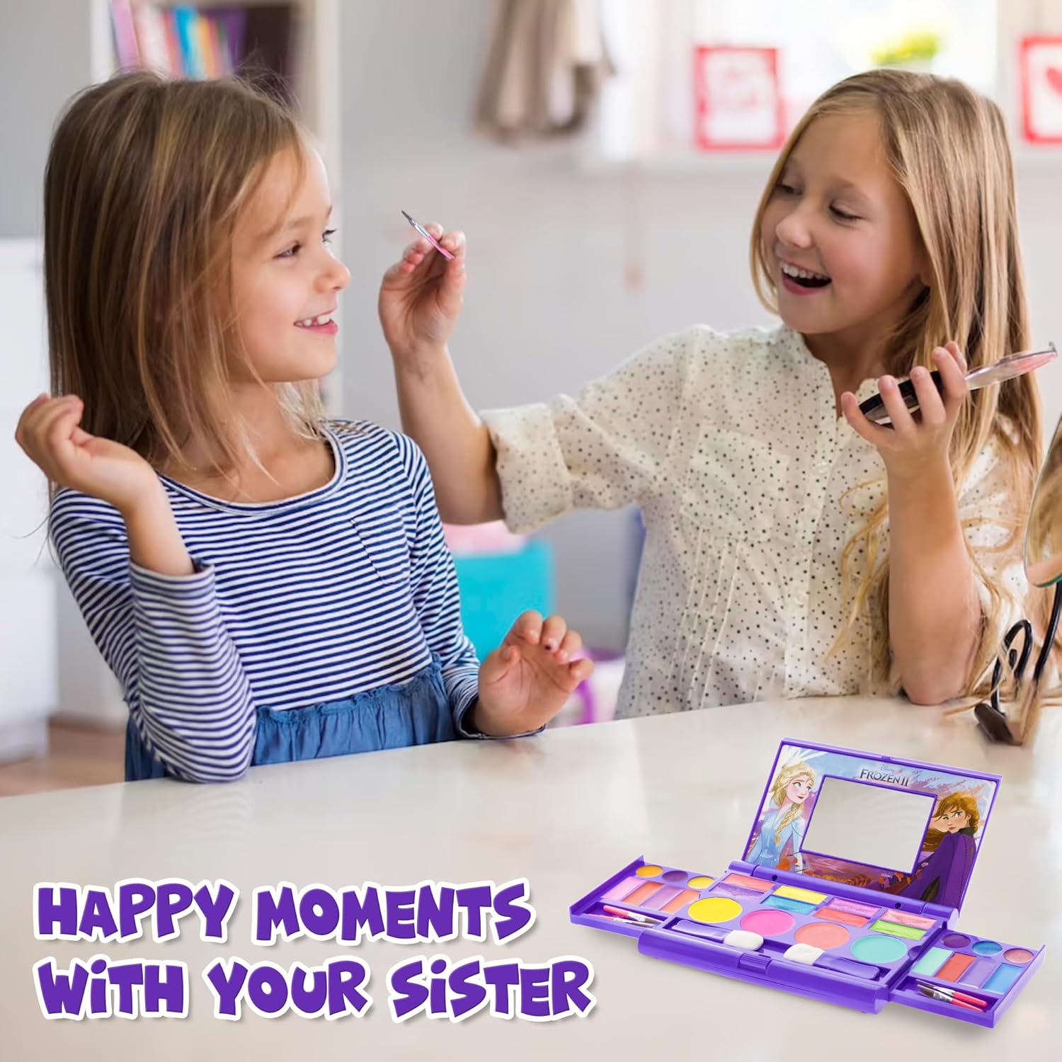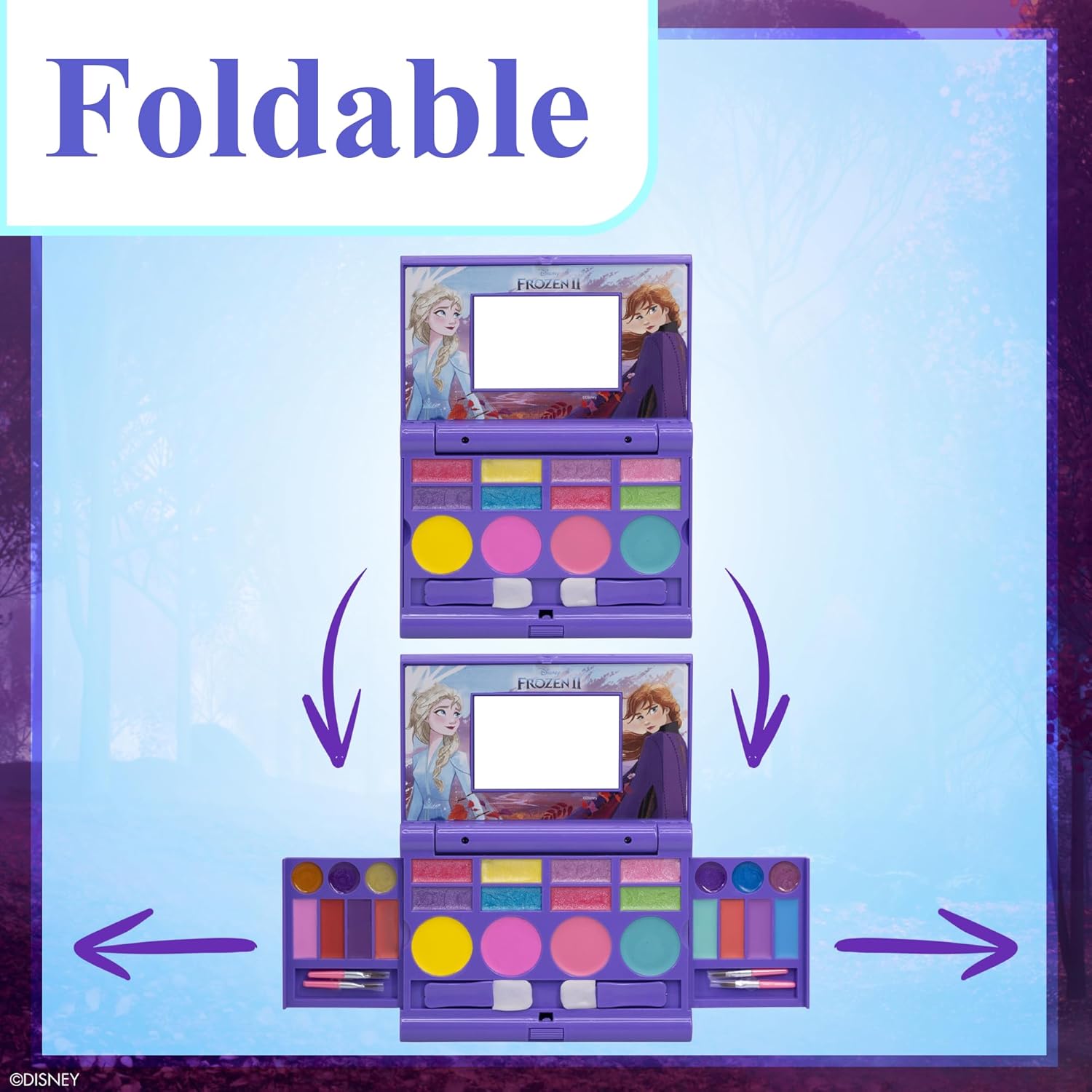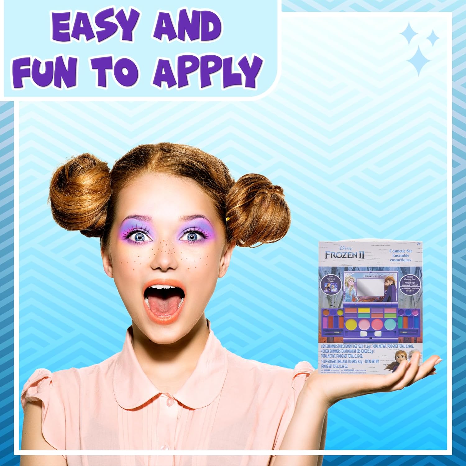 Disney Frozen Elsa Anna Cosmetic Compact Set with Mirror 22 lip glosses, 4 Body Shines, 6 Brushes Colorful Portable Foldable Washable Makeup Beauty Kit Box Set for Girls Kids Toddler