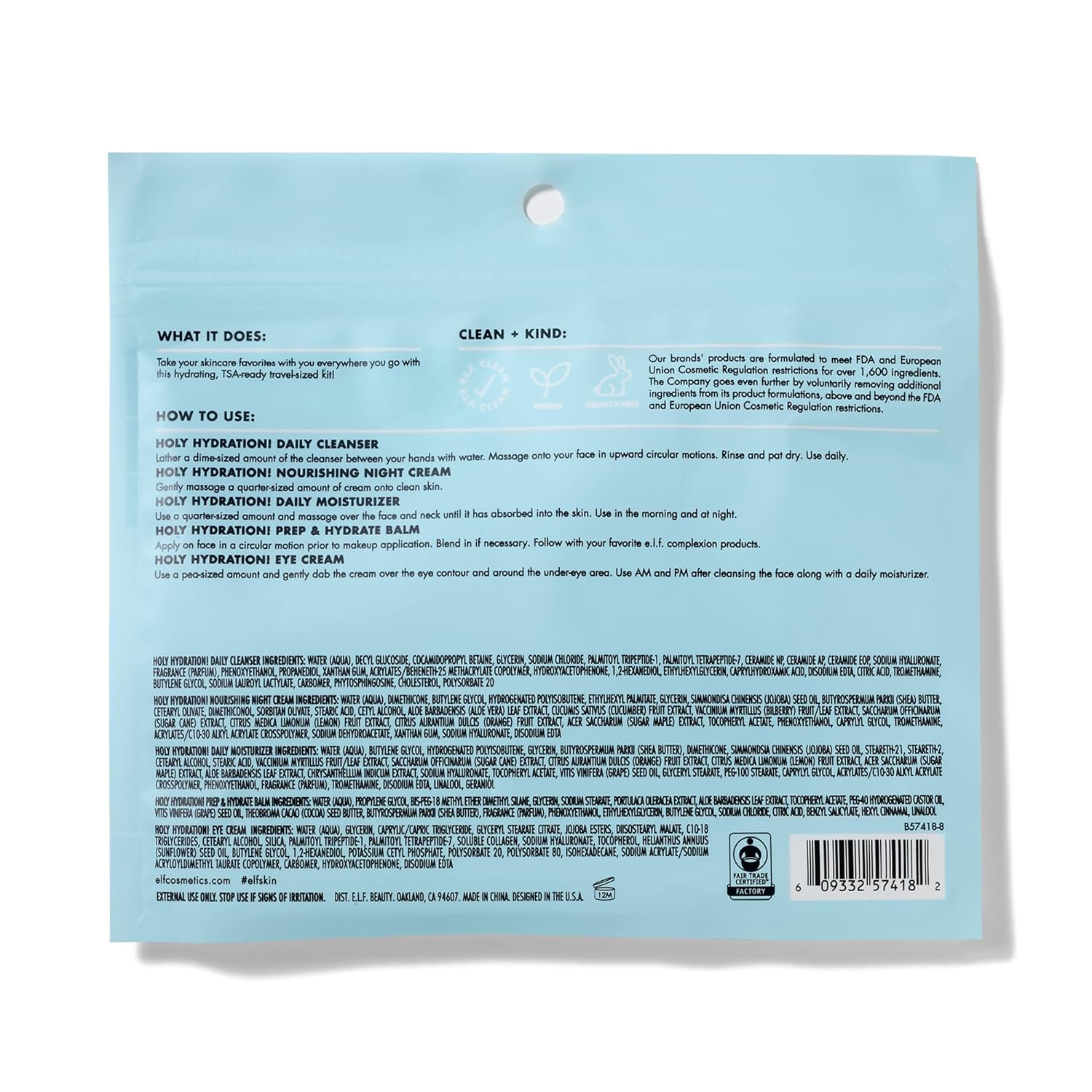 - SKINCARE ON THE GO: The e.l.f. Jet Set Hydration Kit contains all of your skincare favourites in a TSA-ready travel-sized kit. The kit includes a Cleanser (30ml), Hydrating Balm (6g), Moisturizer (25ml), Eye Cream (7g) and Night Cream (15g).
