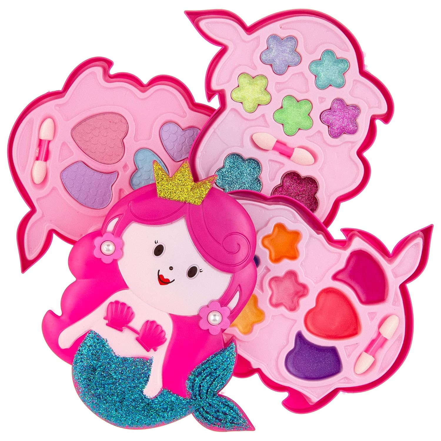 - Mermaid Beauty Kit – 3-Tiered, Mermaid Shaped Cosmetic Case Featuring 3 Dual Ended Applicators, 6 Eyeshadow Wells, 7 Lip Gloss Wells, And 7 Glitter Gloss Wells In Fun Shapes.