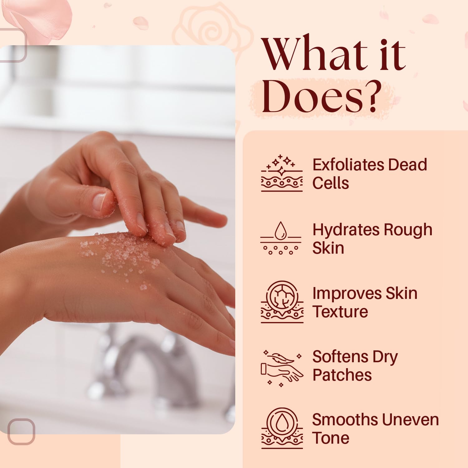 - Product Benefits : Exfoliating, Cleansing, Softening, Hydrating