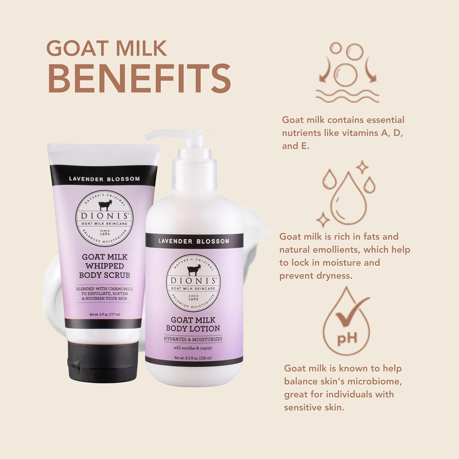 Dionis Goat Milk Skincare Lavender Scented Whipped Body Scrub & Lotion Gift Set - Gentle Chamomile Blended Exfoliating Sugar Scrub & Hydrating Body Cream Set, 6 oz & 8.5 oz