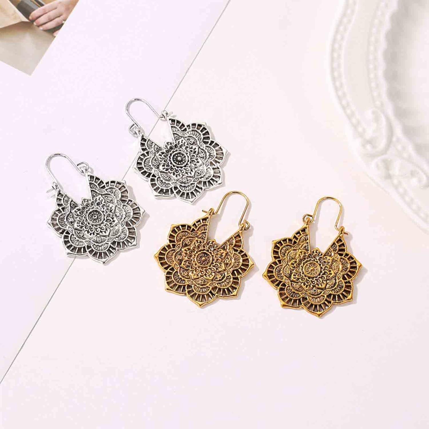 Boho Mandala Flower Earrings Gold Drop Dangle Earrings Tribal Earrings Vintage Ethnic Hoop Earrings Jewelry for Women and Girls