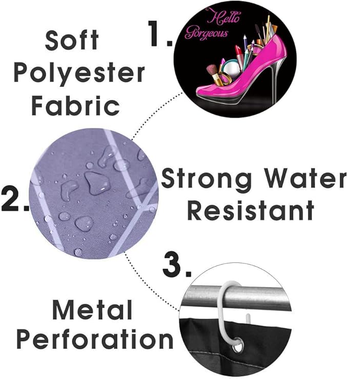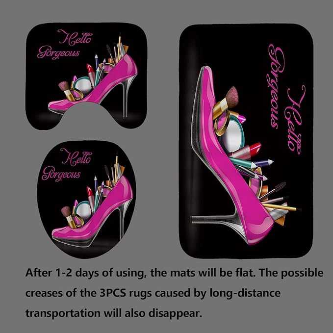 4PCS Hello Gorgeous Shower Curtain Set, Hot Pink High Heels Lipstick Makeup Fashion Girls Women Bathroom Decor, Waterproof Fabric Black Shower Curtain, Non-Slip Bath Mat Toilet Rug, Hot Pink