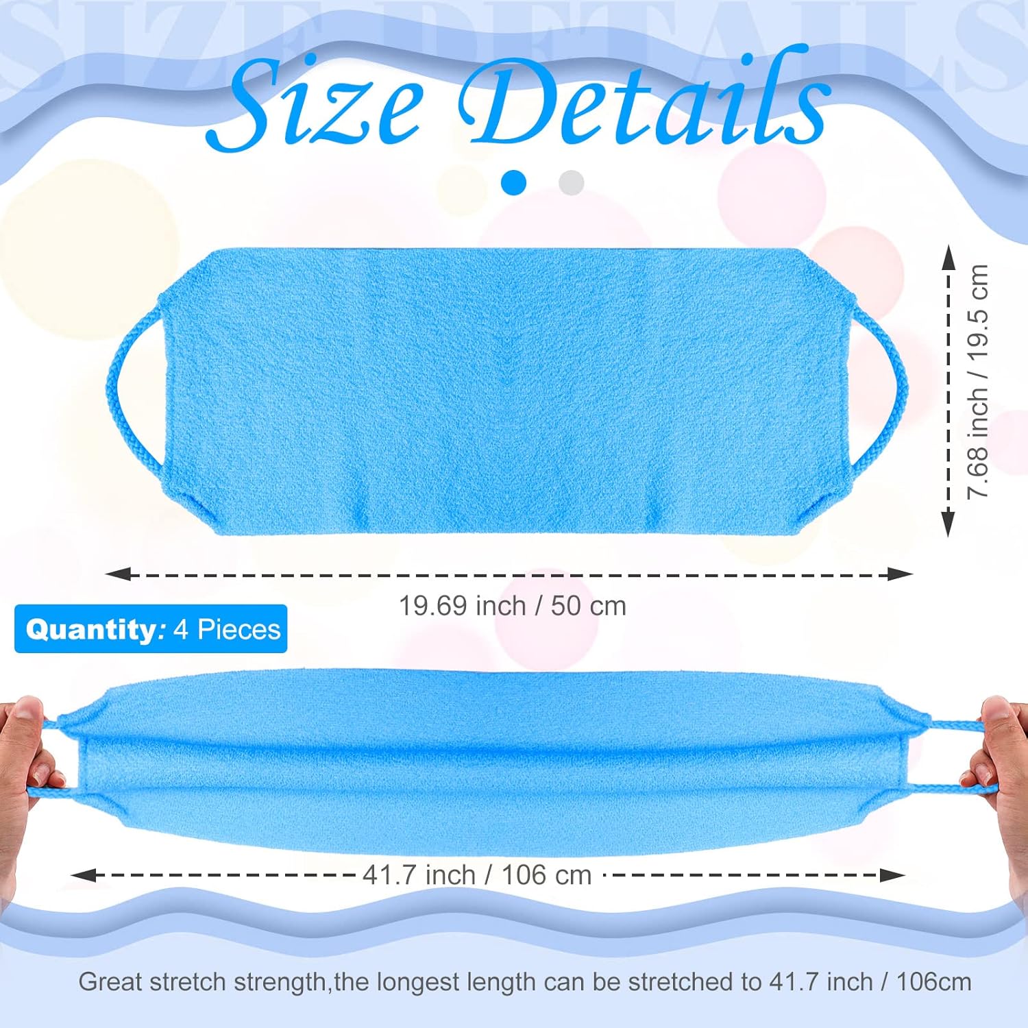 - Body Exfoliator Set: you will receive a package including 4 pieces of back scrubbers with handles in deep blue and gray, which normal dimension is about 52 x 18 cm/ 20.5 x 7.1 inches, the extended length can reach 37 inches, which is a good combination for your daily use and replacement