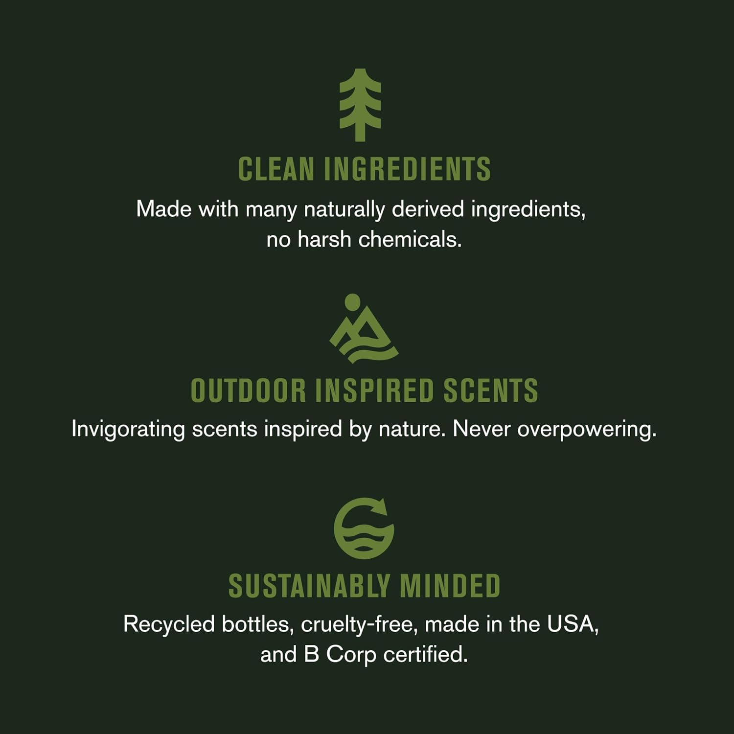 - OUTDOOR INSPIRED SCENTS: Sandalwood and Amber with a rich, complex finish; Sea Minerals and crisp Citron with a complex, fresh finish; Cedar and herbaceous Red Sage with a peppery rugged finish.
