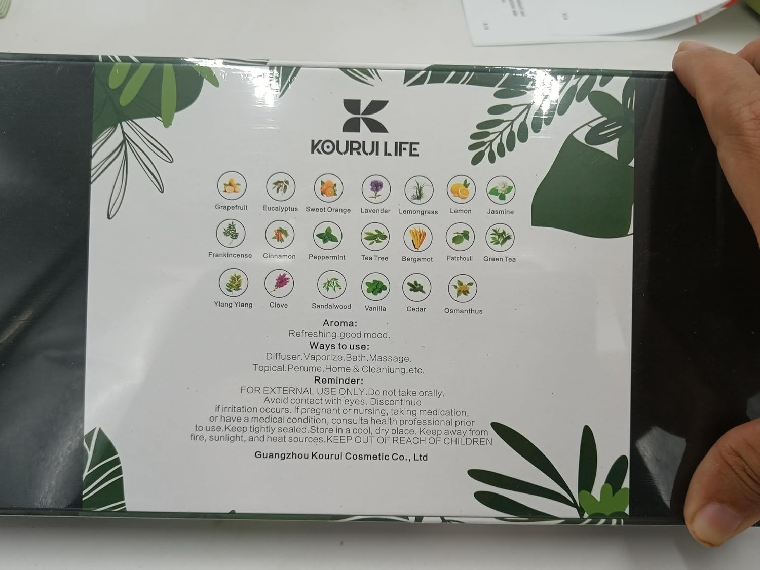 - 20 BOTTLES DIFFERENT FRAGRANCE OIL - - The organic essential oils with 20 different scence, include Ylang Ylang, Patchouli, Cedar, Clove, Green Tea, Osmanthus, Jasmine, Sandalwood, Vanilla, Lemon, Grapefruit, Eucalyptus, Cinnamon, Sweet Orange, Lemongrass, Frankincense, Peppermint, Tea Tree, Bergamot, Lavender oils.