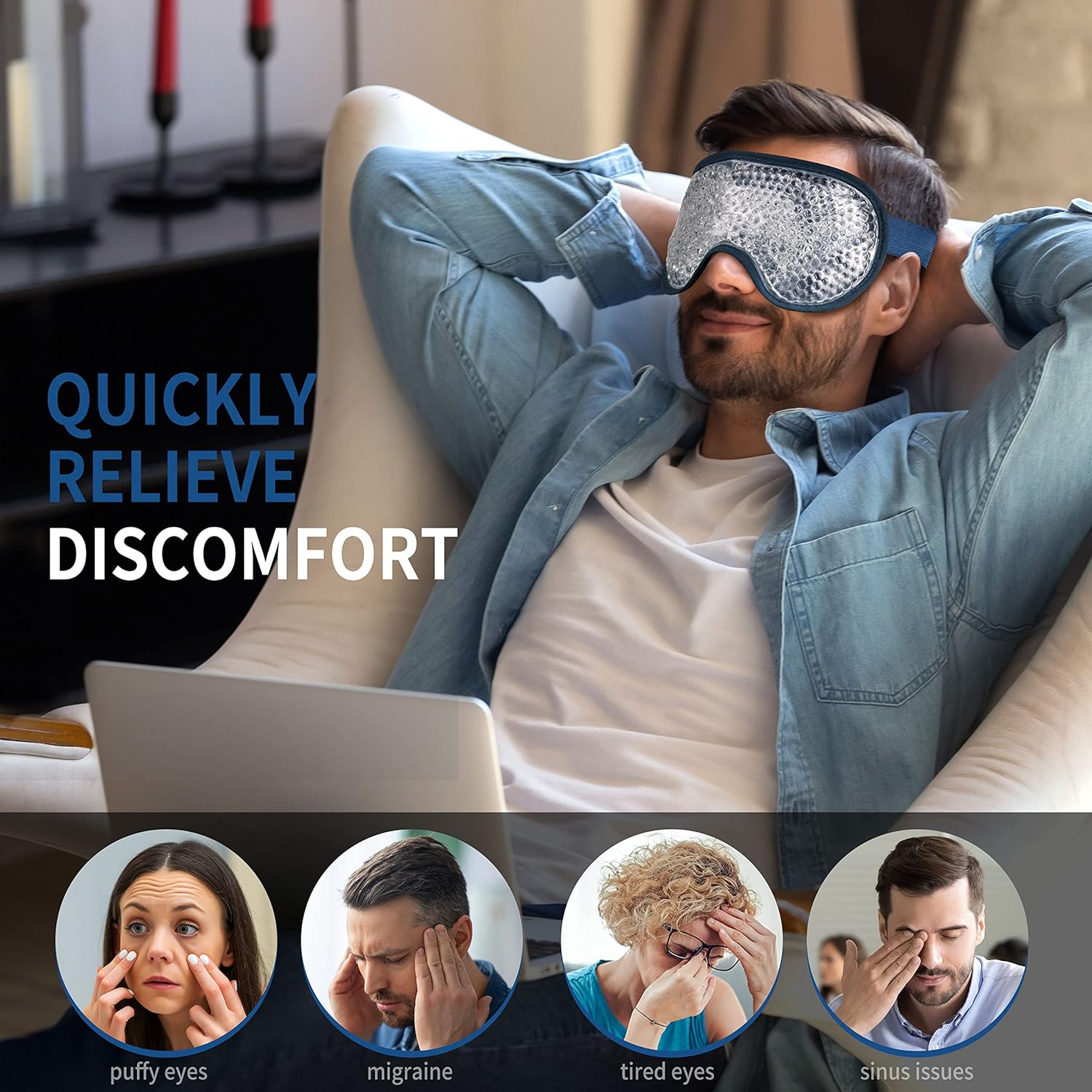 - RELIEVE DISCOMFORT: The gel bead eye mask is a quick and easy way to relieve your eye discomfort. Freeze the gel eye mask and put it on your eyes to reduce puffiness from a night of poor sleep or a late night, or to relieve tired eyes that have been staring at a computer all-day
