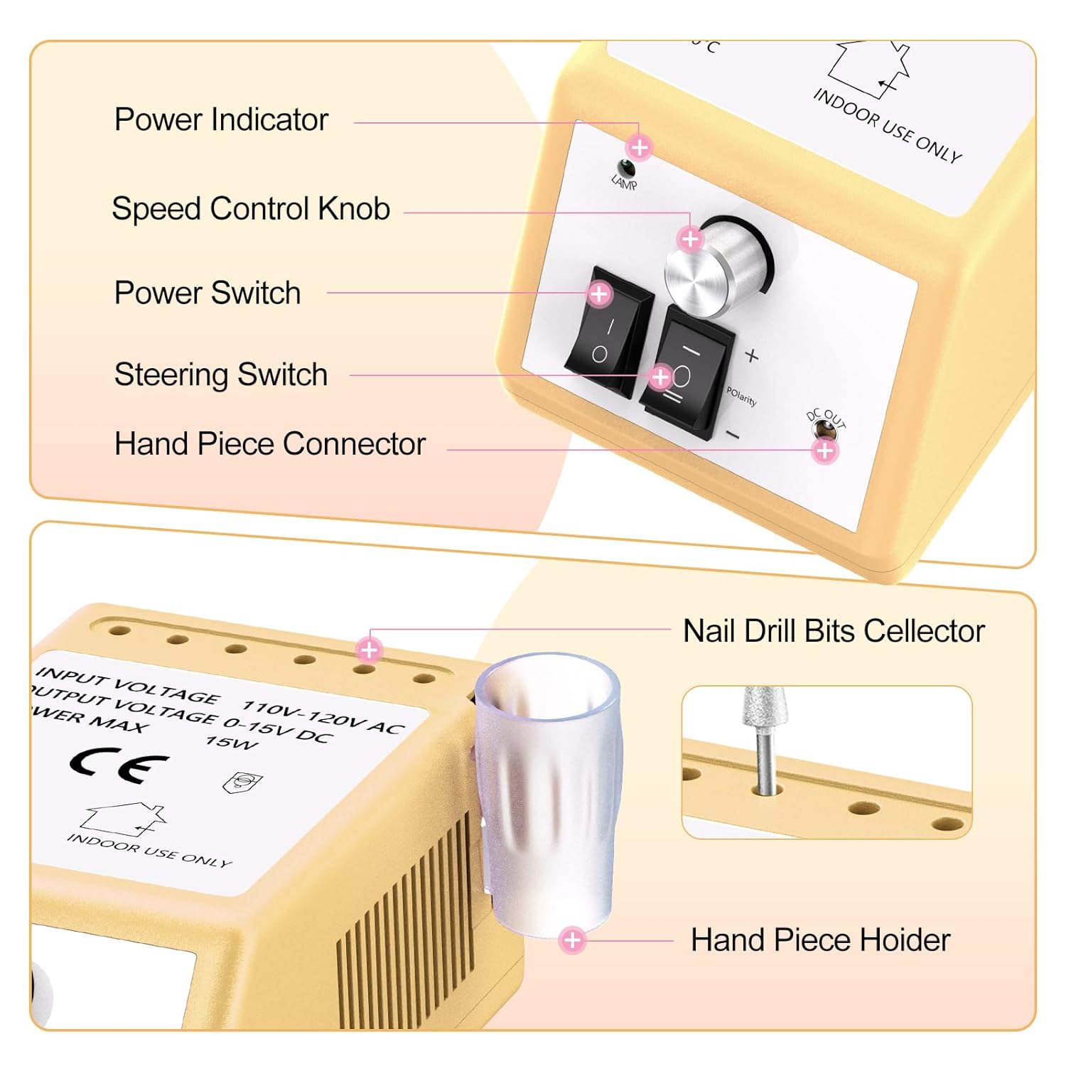 - Compact Electric Nail File:Nail drills for acrylic nails are compact enough for your desk, our nail drill machine designed with 6 nail drill bits holder and hand piece holder, it is more convenient for your manicure and pedicure