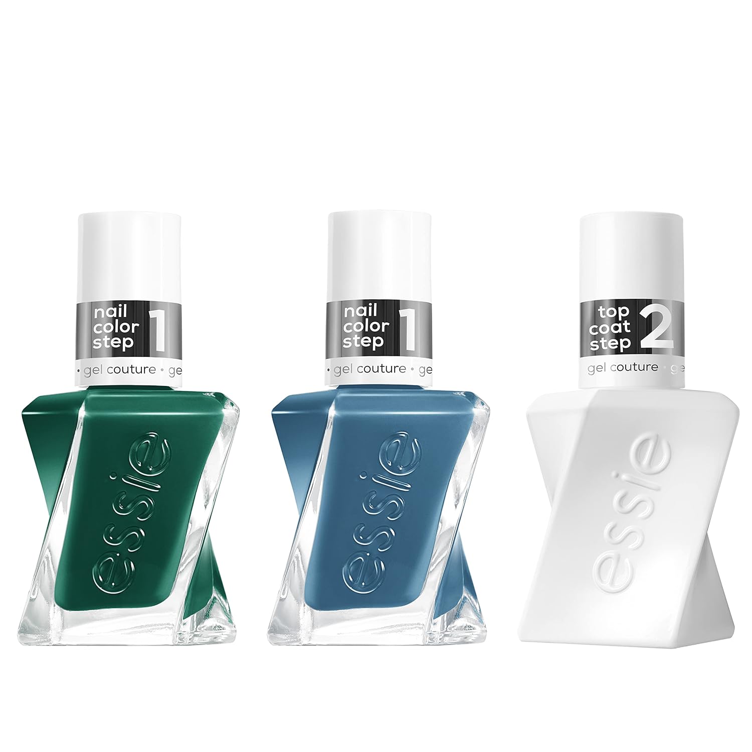 Essie Nail Polish Set, Daisy Jones & The Six Inspired, Longwear Gel-like Nail Polish, Cut Loose, Blue, + Invest In Style, Green + Gel-like Shiny Top Coat