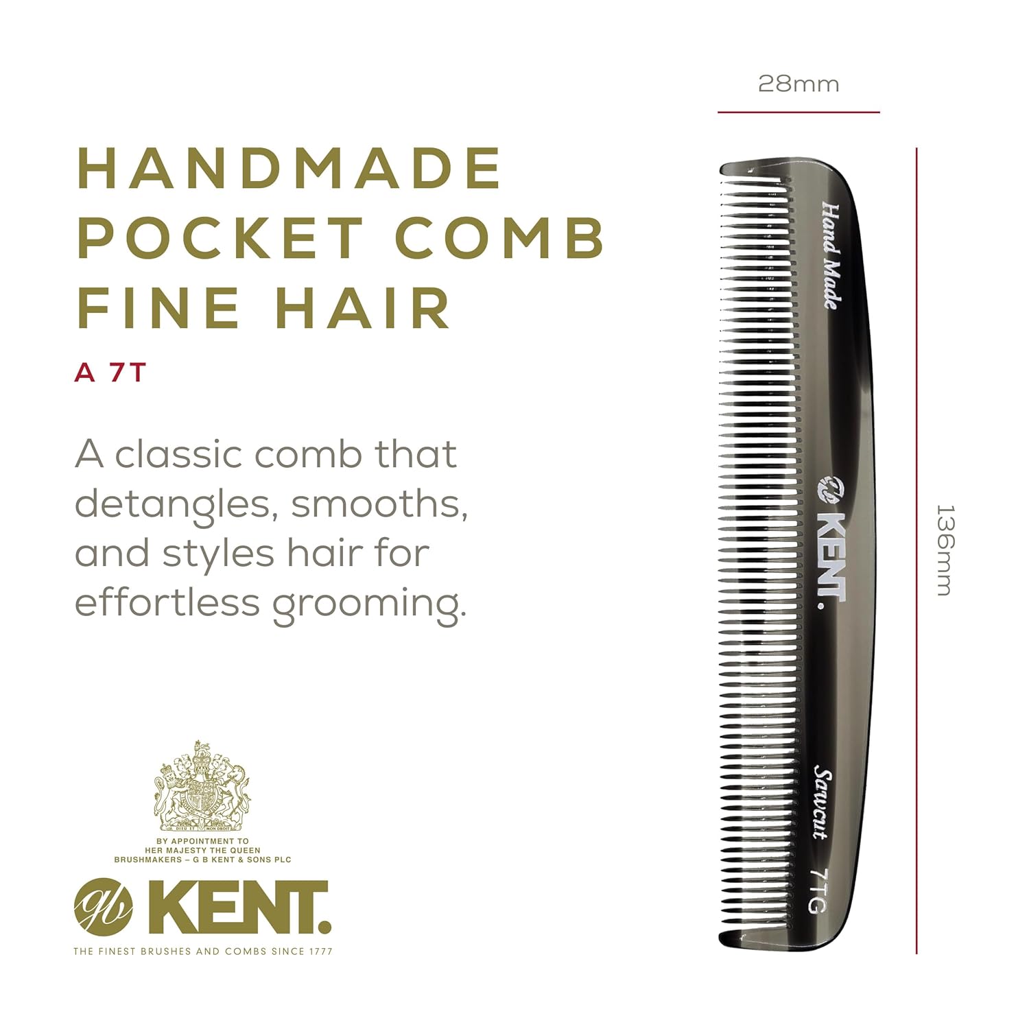 Kent 7T G All Fine Tooth Pocket Comb - Handmade Grooming Comb for Styling, Travel, Mustache and Beard Care - Saw Cut and Hand Polished