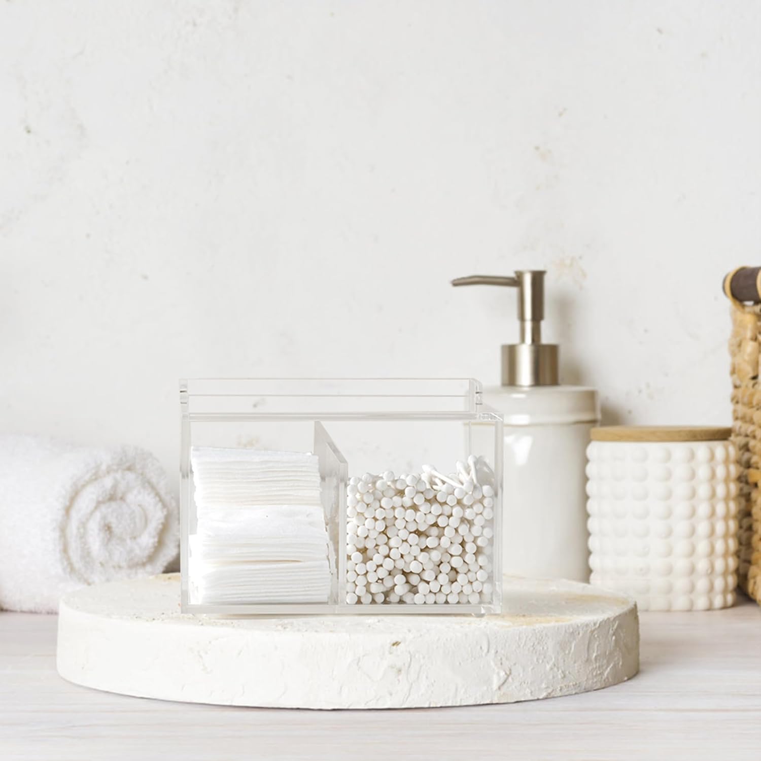 - Premium Acrylic Material: Cotton swab holder is made of premium acrylic with high purity and clarity, which is stable, long-lasting and environmentally friendly. PLEASE DO NOT USE ANY ALCOHOLIC CLEANER TO WASH, to prevent damage to products. Use soft cloth to wipe instead