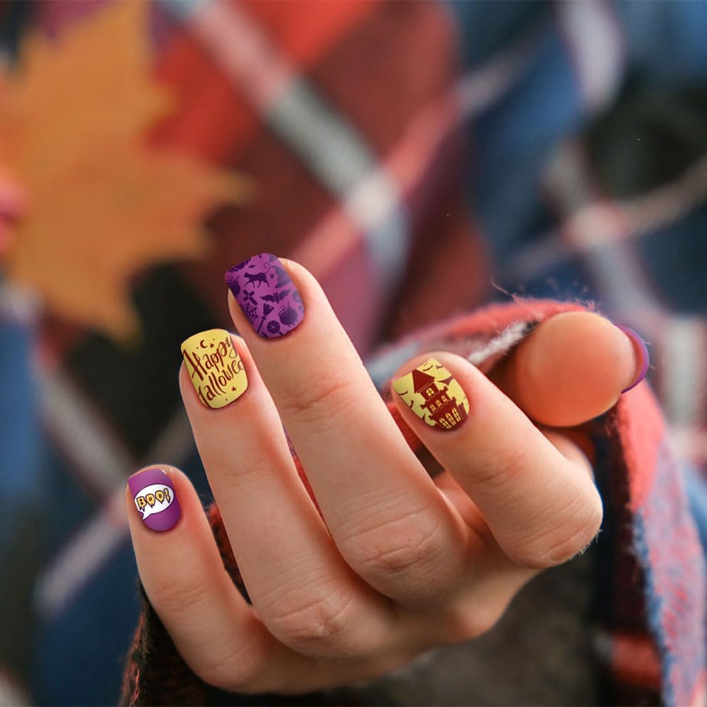 - Package Contains: 6 pieces Halloween nail stamping templates, including pumpkin, spider web, bat, ghost, skeleton, blood, fence, plaid background, witch, gnome, castle, cat and Halloween words, etc.. Each template contains a lot of sketches and offers you multiple choices to create proper style and make your nail more attractive. Notice: the stamp and scraper are not included.