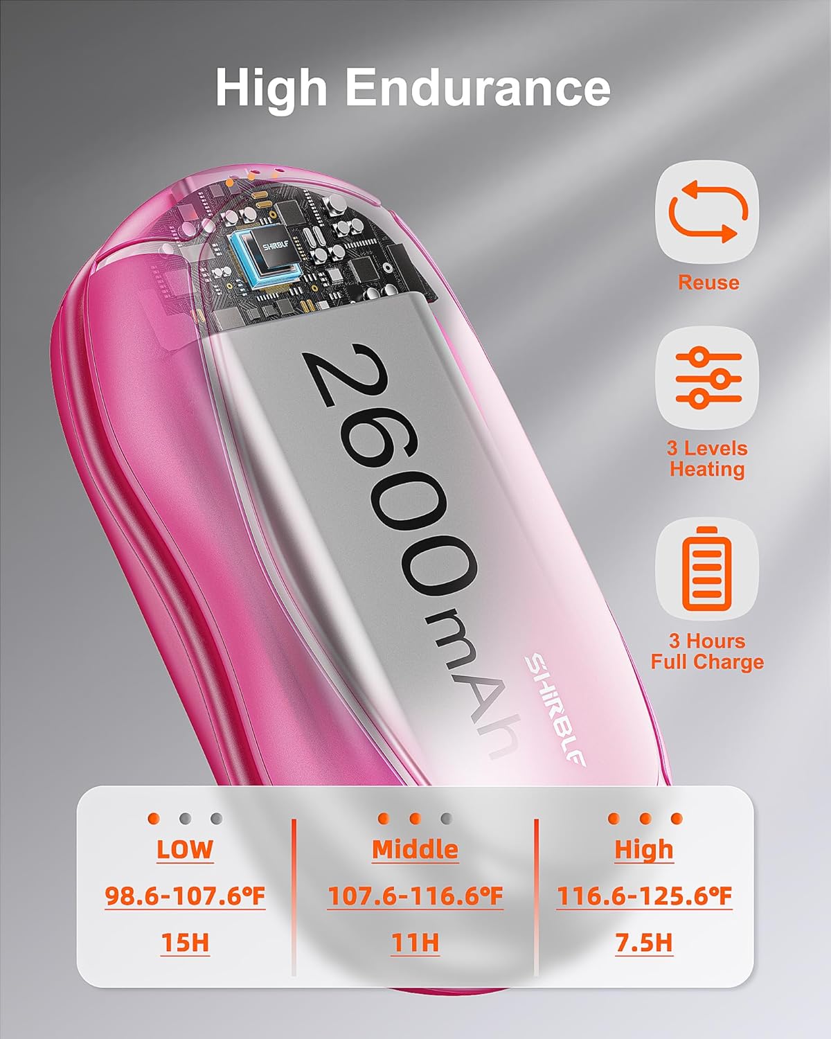 - 【Three Seconds Quick Heat】There is an on button on the top of the electric hand warmers rechargeable, press and hold for three seconds and the reusable hand warmer will turn on the heating to 105.8℉-114.8℉-125.6℉. Adjust the suitable temperature according to different temperature needs.