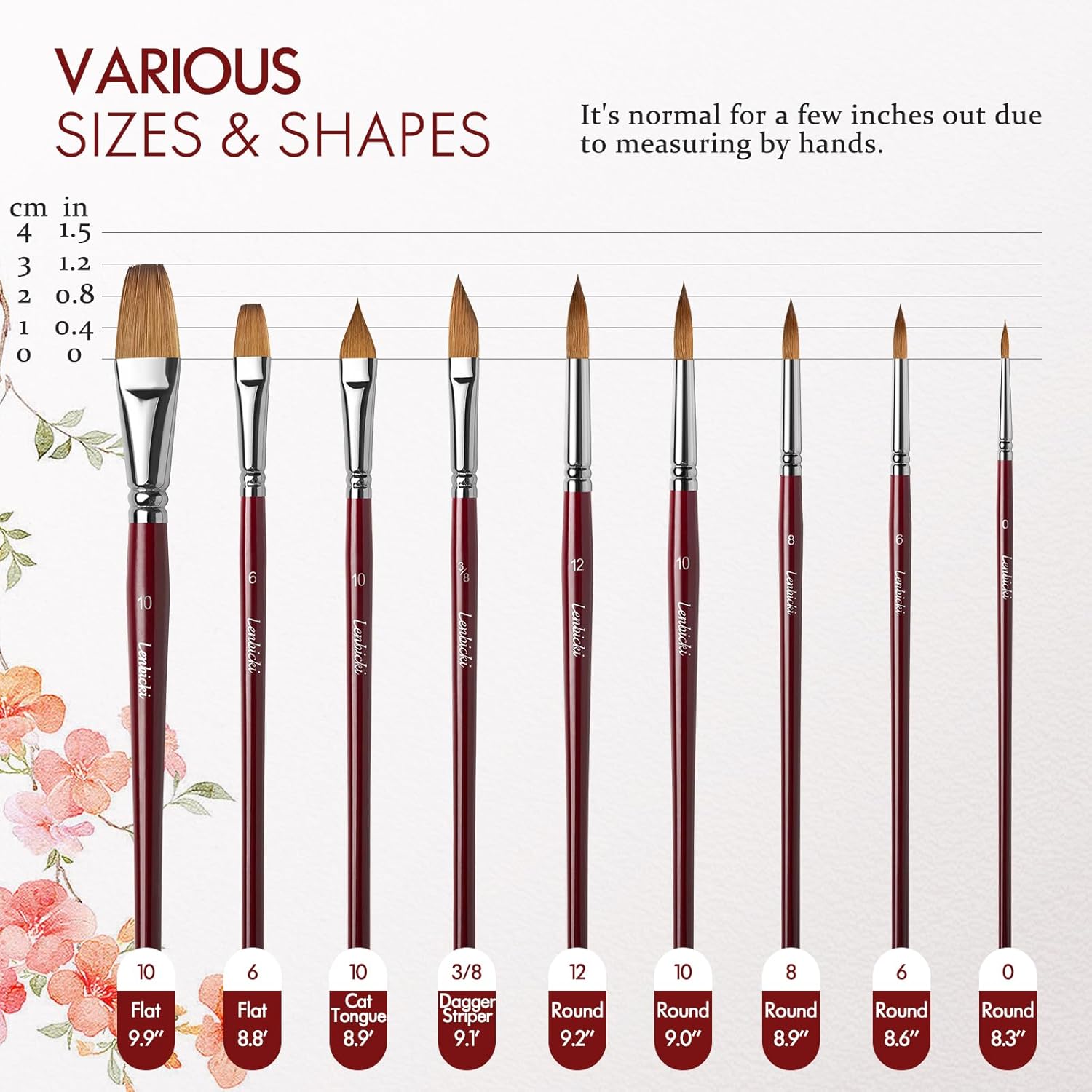 Kolinsky Sable Paint Brushes Professional Kolinsky Watercolor Paint Brushes Set for Artists 9pcs,Kolinsky Sable Hair Brushes for Watercolor, Acrylic, Includes Round Pointed, Flat, Cat's Tongue