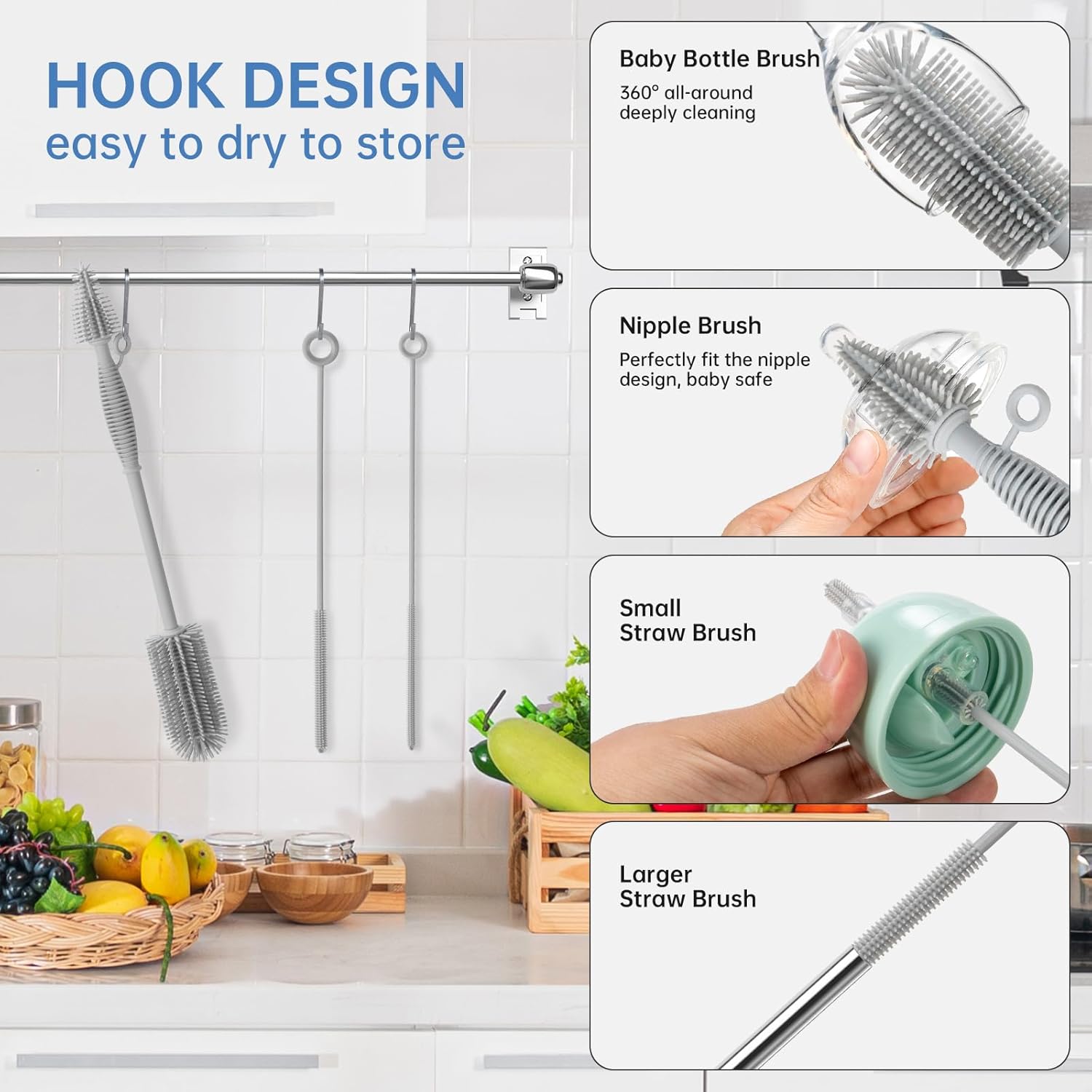 - Complete Baby Bottle Brush and Straw Cleaner Brush Set: In addition to the bottle brush, this set also includes two silicone straw cleaner brushes for complete cleaning coverage. This sturdy and flexible set reaches deep inside containers and straws for total cleanliness