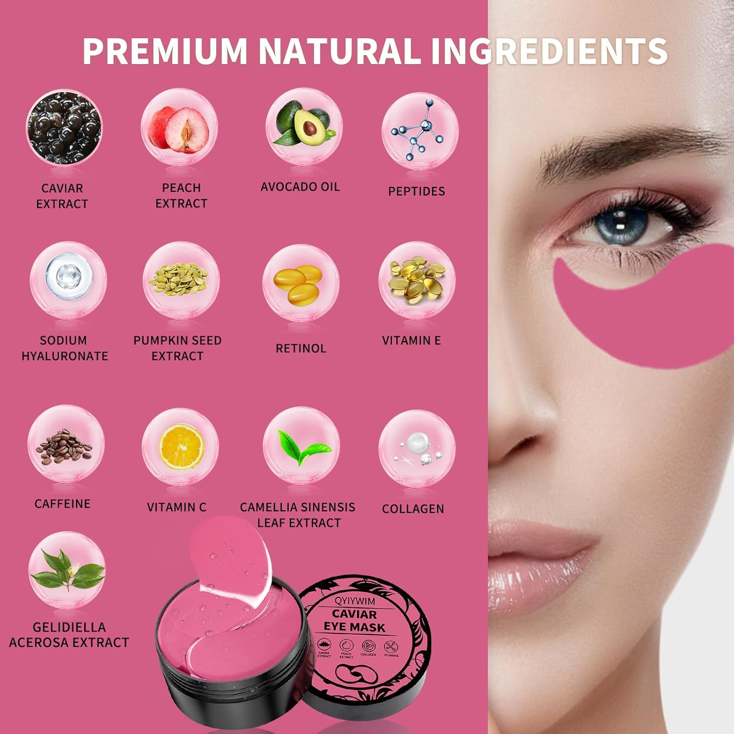 - Premium Natural Ingredients: Our under eye patches contain a blend of premium natural ingredients, such as caviar extract, peach extract, pumpkin seed extract, and sodium hyaluronate ensuring a rejuvenating and nourishing under eye treatment. From eye patches for wrinkles to eye patches for puffy eyes and dark circles, our eye treatment products cater to various concerns, guaranteeing customer satisfaction and serving as a dark circles under eye treatment for women and men.