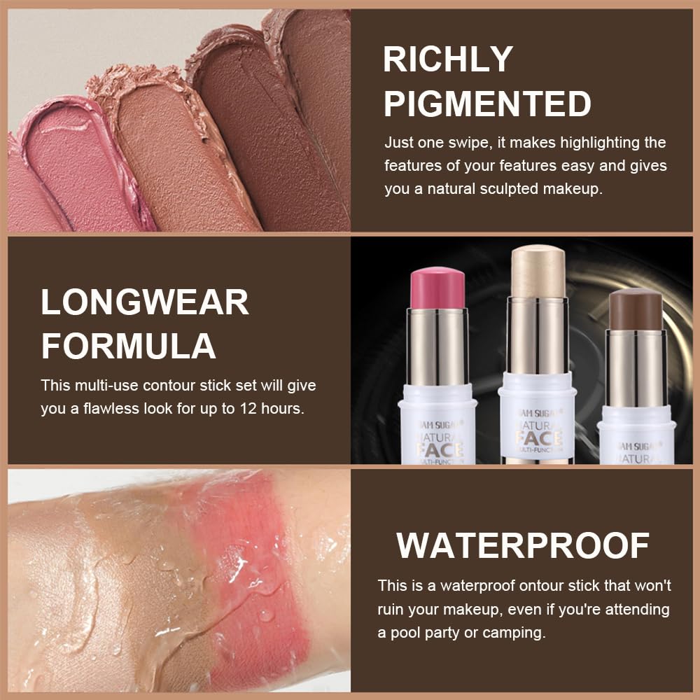 - FACE CONTOUR STICK TRIO —— The face beauty wand trio consists of a shade bronzer stick, blush stick and highlighter stick. It effortlessly buildable more defined features and imparts a natural, healthy, rosy complexion to the face. Both make-up artists and beginners can handle this face contour stick.