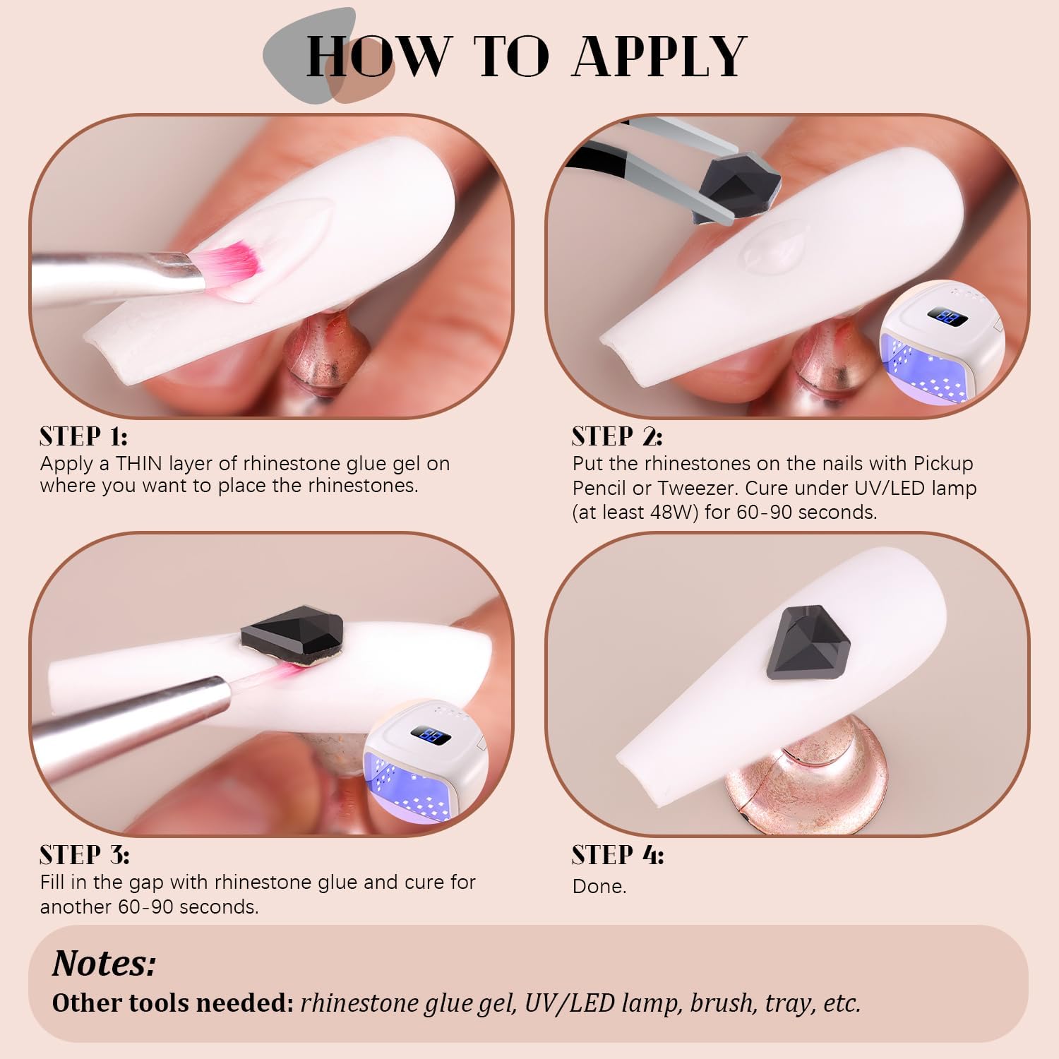 - ๐EASY TO USE -- Easy to apply on artificial nails. After applying nail polish and applying enough gel on the nails, simply use the equipped tools (pickup pen + tweezers) to pick up the crystals onto your nails to create your fabulous DIY designs! These crystals gemstones are different from those hotfix stones, they are not self-adhesive, you have to apply glue to stick them (glue is not included.)