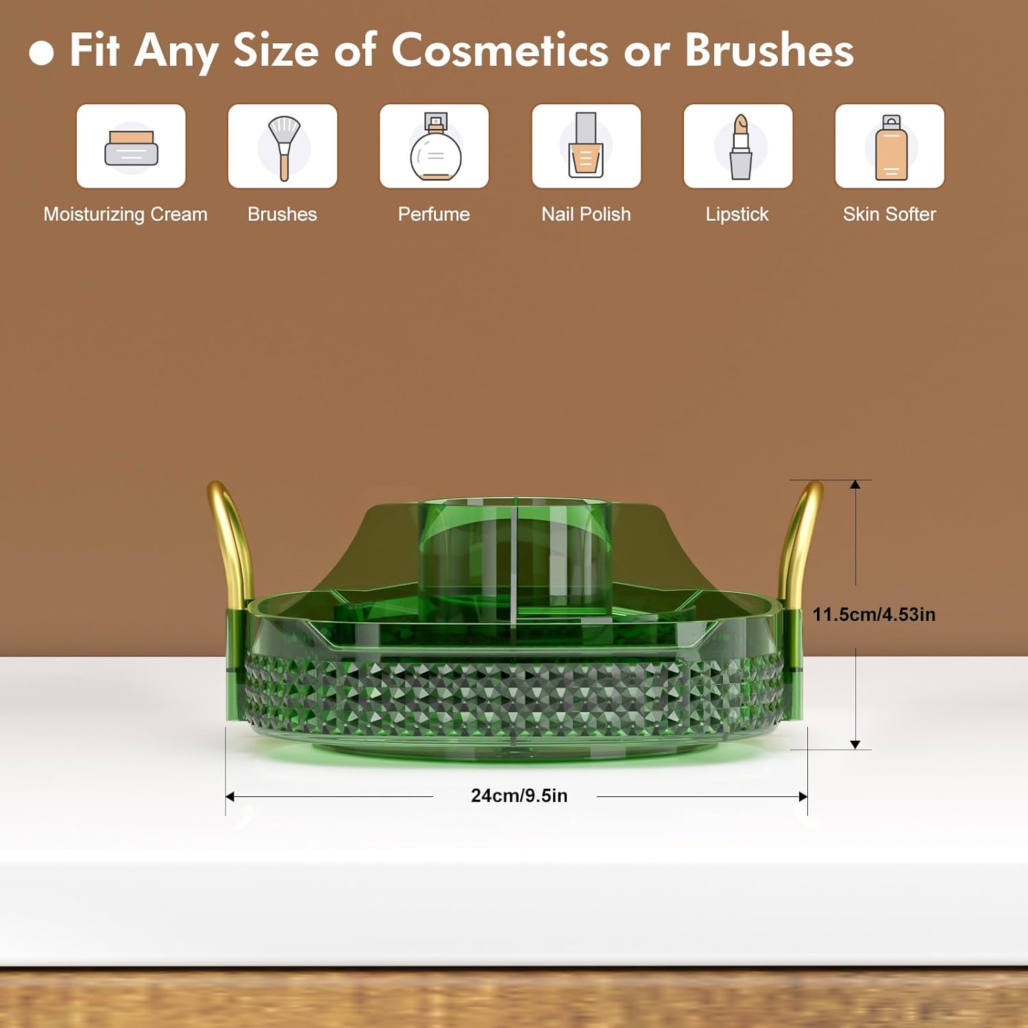 Awenia Rotating Makeup Organizer 360, Stackable Adjustable Large Capacity Cosmetic Storage Unit,Dresser Bathroom Kitchen Countertop Organizer with Metal Handle, Plus Size (Gem Green, 1 Tier)