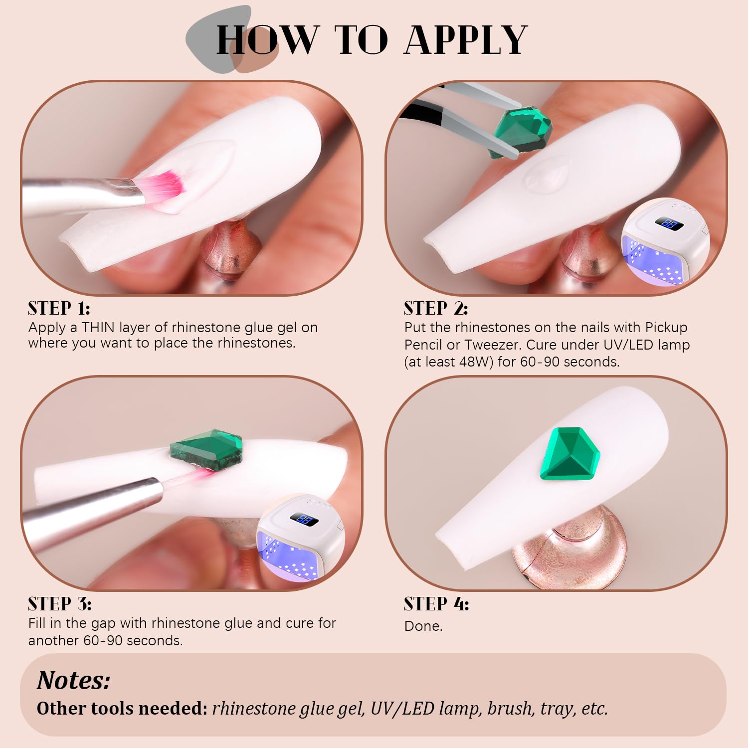 - ๐EASY TO USE -- Easy to apply on artificial nails. After applying nail polish and applying enough gel on the nails, simply use the equipped tools (pickup pen + tweezers) to pick up the crystals onto your nails to create your fabulous DIY designs! These crystals gemstones are different from those hotfix stones, they are not self-adhesive, you have to apply glue to stick them (glue is not included.)