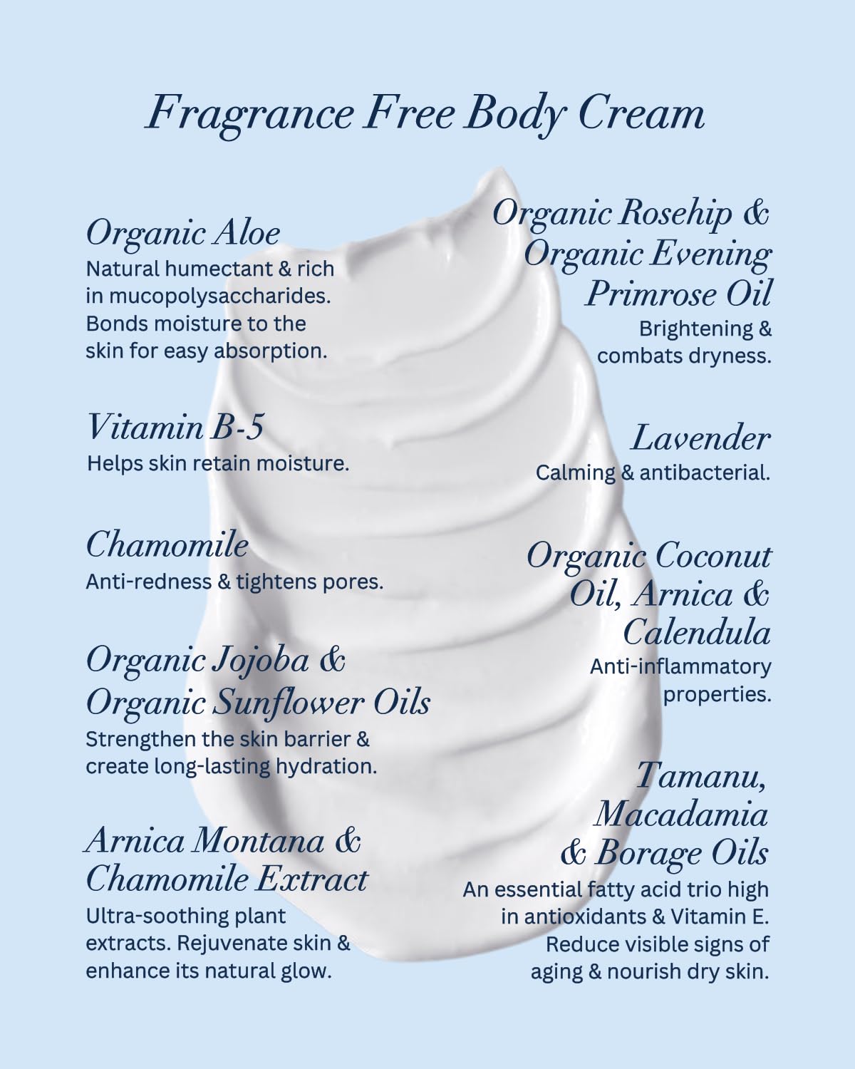 - Our Fragrance Free Body Cream is formulated with natural ingredients to deeply moisturize and nourish your skin, leaving it feeling soft, supple, and rejuvenated.