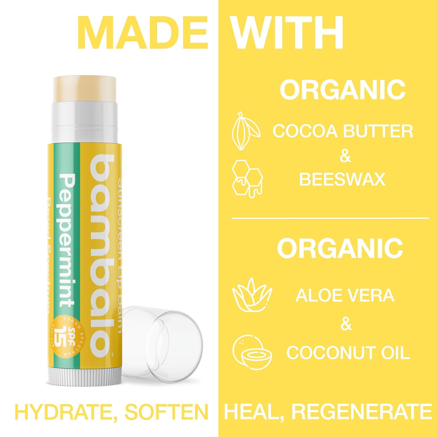 4-Pack Peppermint SPF 15 Lip Balm - Organic Ingredients, Broad Spectrum UVA/UVB Protection - Hydrating & Moisturizing, USA Made