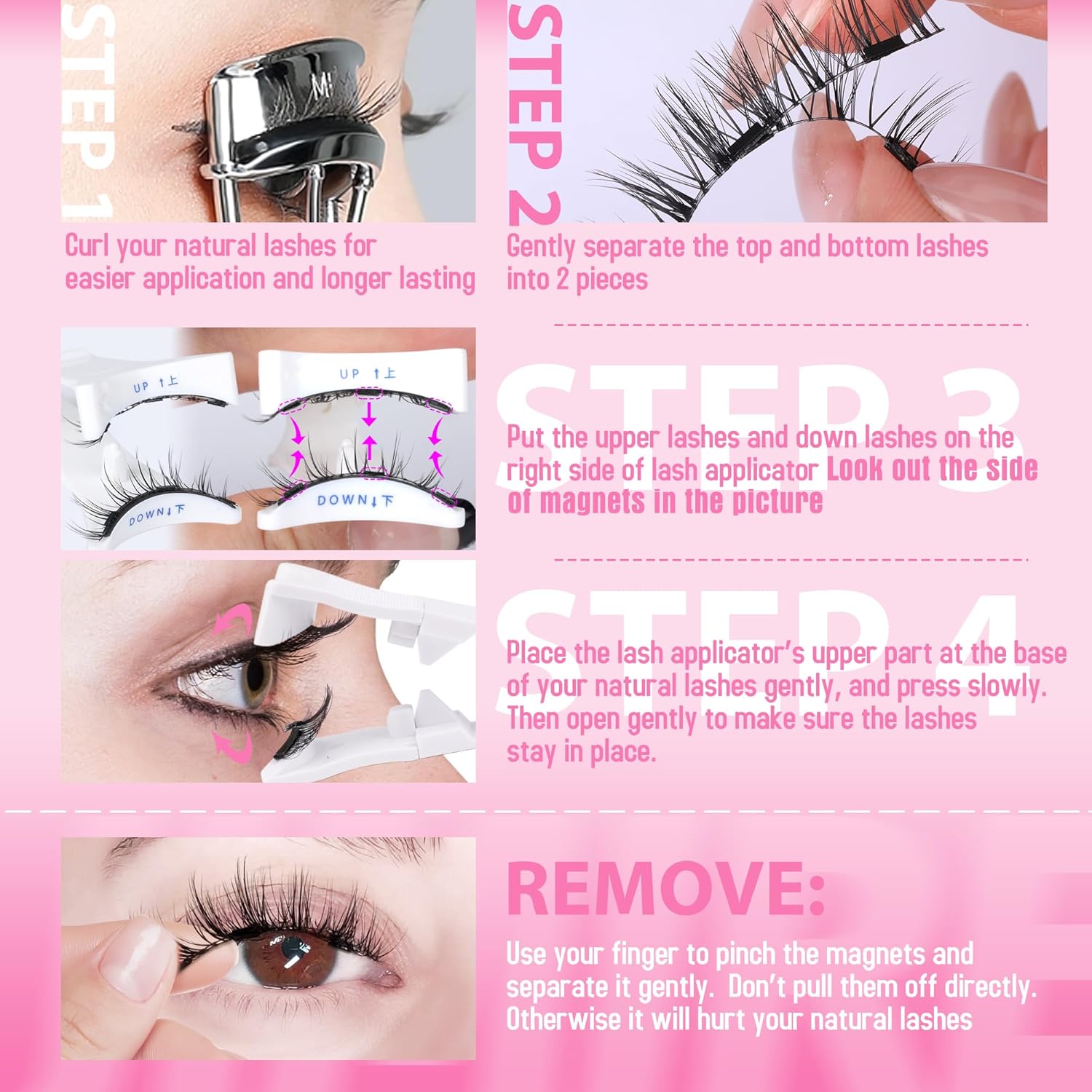 - Easy to Wear with Lash Applicator - ①Curl your natural lashes ②Gently separate the top and bottom lashes into 2 pieces ③Put top and bottom lashes on the right side of applicator, please note that the top and bottom magnetic pieces are placed FACING EACH OTHER. ④ Place the lash applicator’s upper part at the base of your natural lashes gently, and press slowly. Then open gently to make sure the lashes stay in place