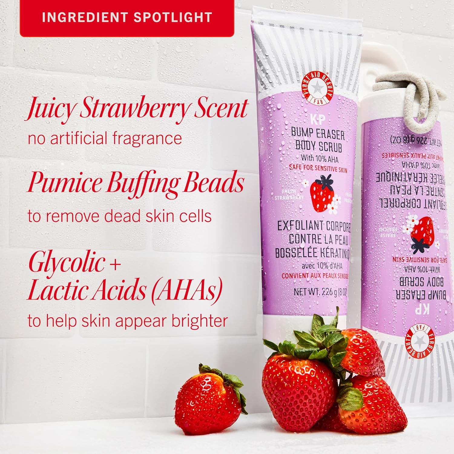 First Aid Beauty - KP Bump Eraser Body Scrub with 10% AHA, Keratosis Pilaris Exfoliator with Glycolic and Lactic acids, Helps Reduce Chicken Skin Bumps, Safe for Sensitive Skin, Strawberry Scent, 8 oz