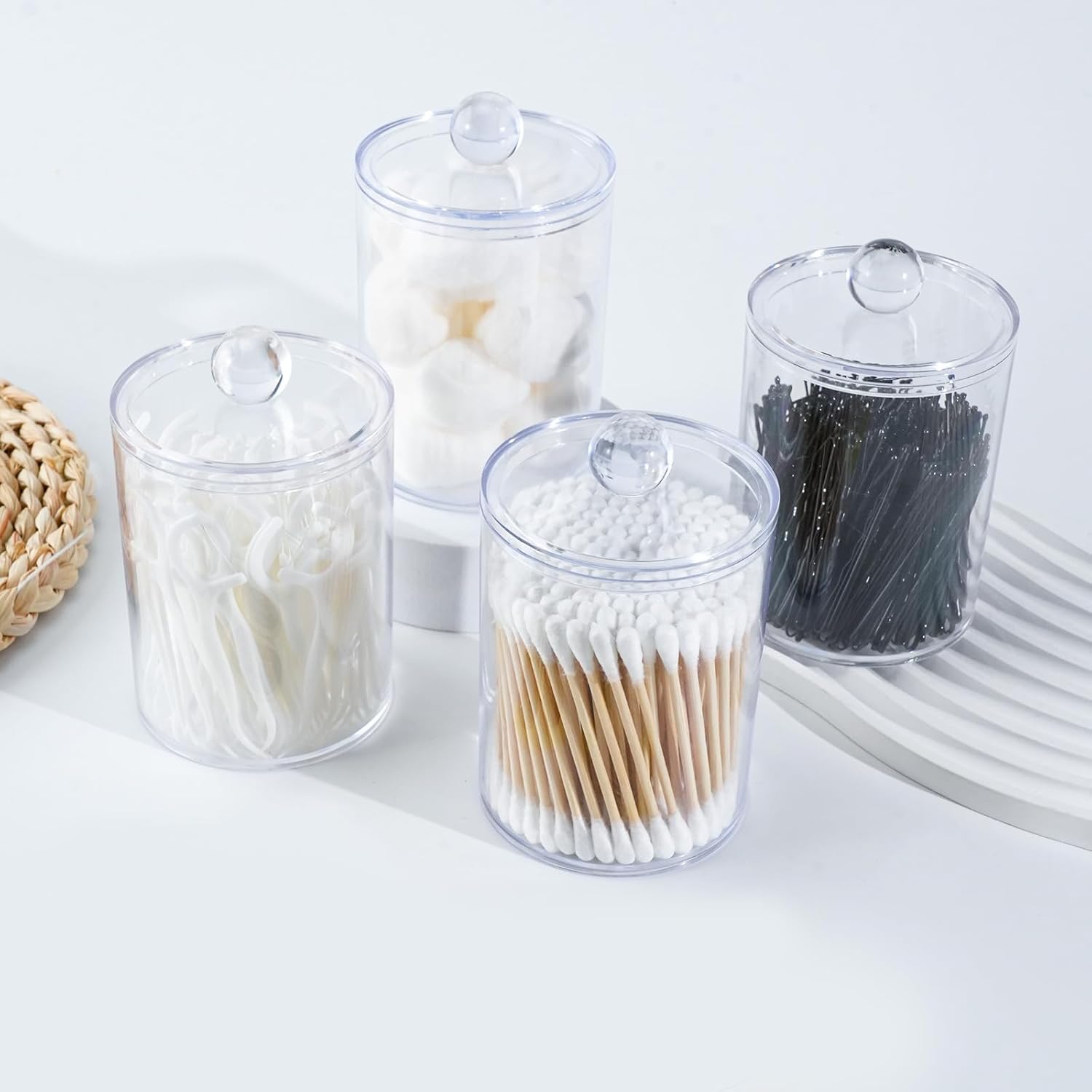 4 Pack Qtip Holder,Canister Apothecary Jar Set, Bathroom Jars with Lids Set for Cotton Swabs, Balls, Pads, Floss Picks,10oz-12oz Plastic Canisters Restroom Bedroom Vanity Organizer