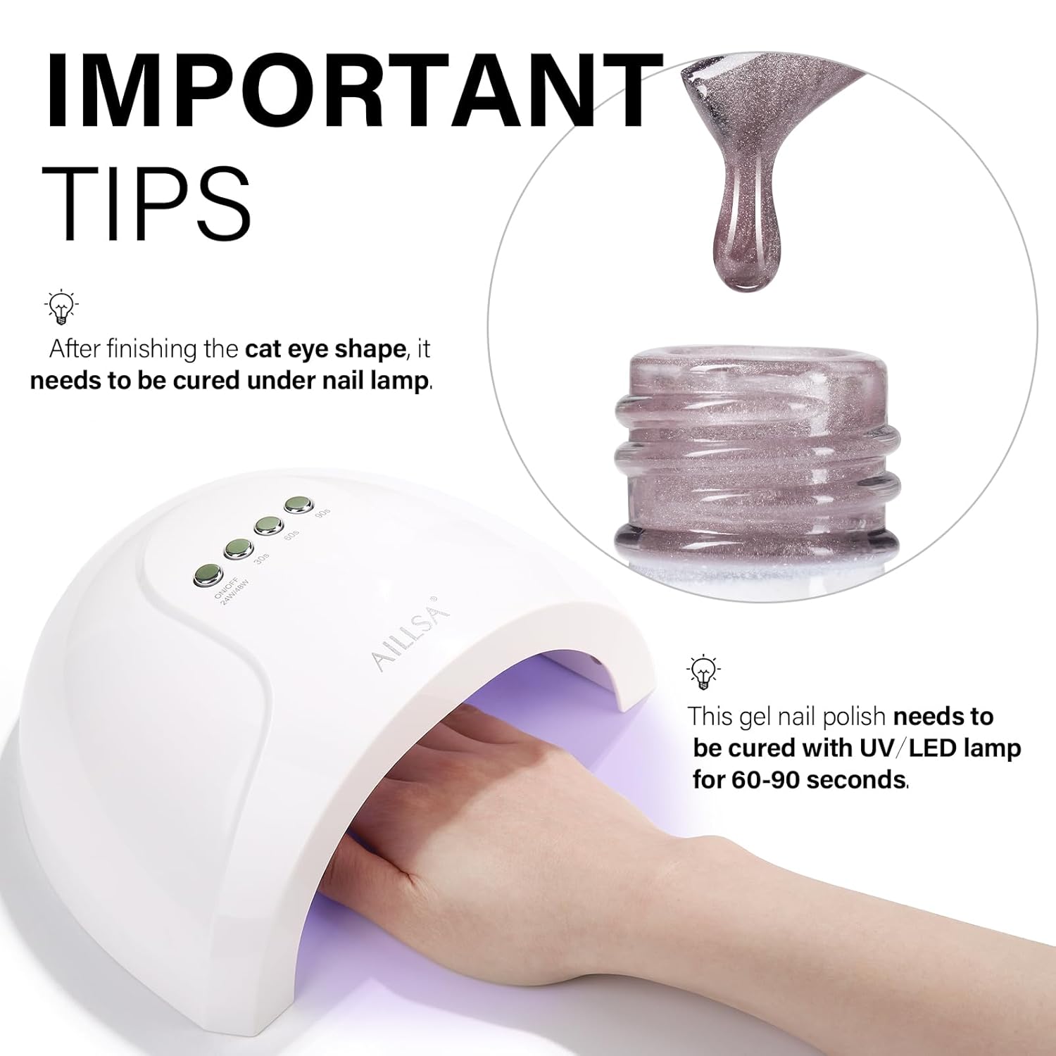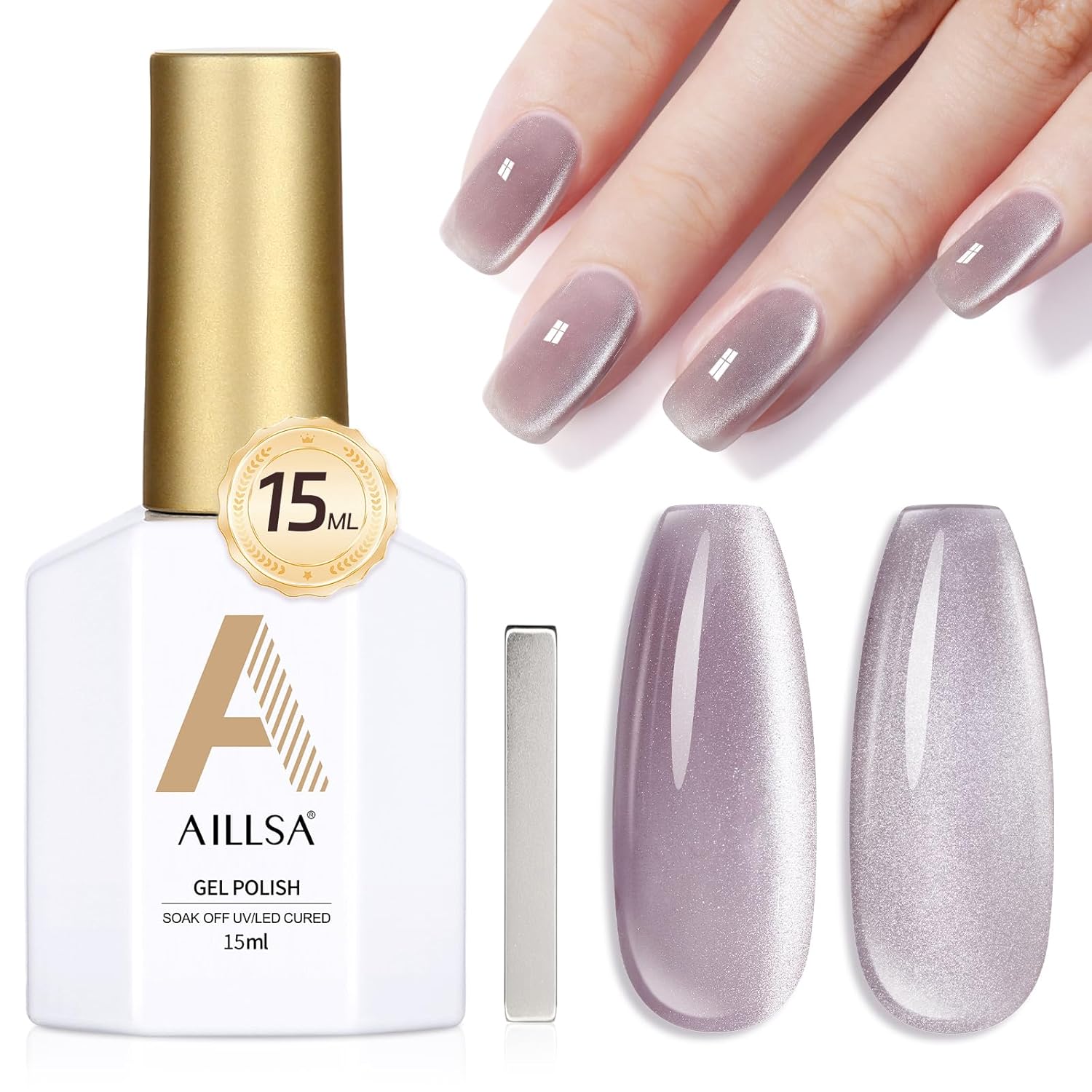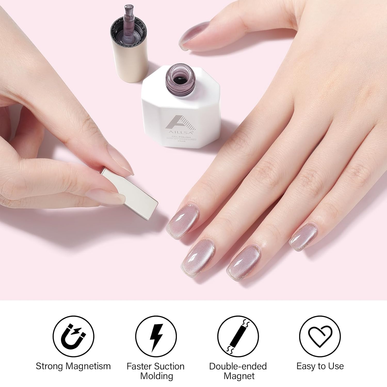 - CRYSTAL SPARKLING EFFECT - AILLSA Cat Eye Gel Nail Polish has a dense magnetic powder that can be used alone for a mirror-shimmering, crystal-clear manicure or with any base color nail polish, jelly gel nail polish, and other nail polishes.