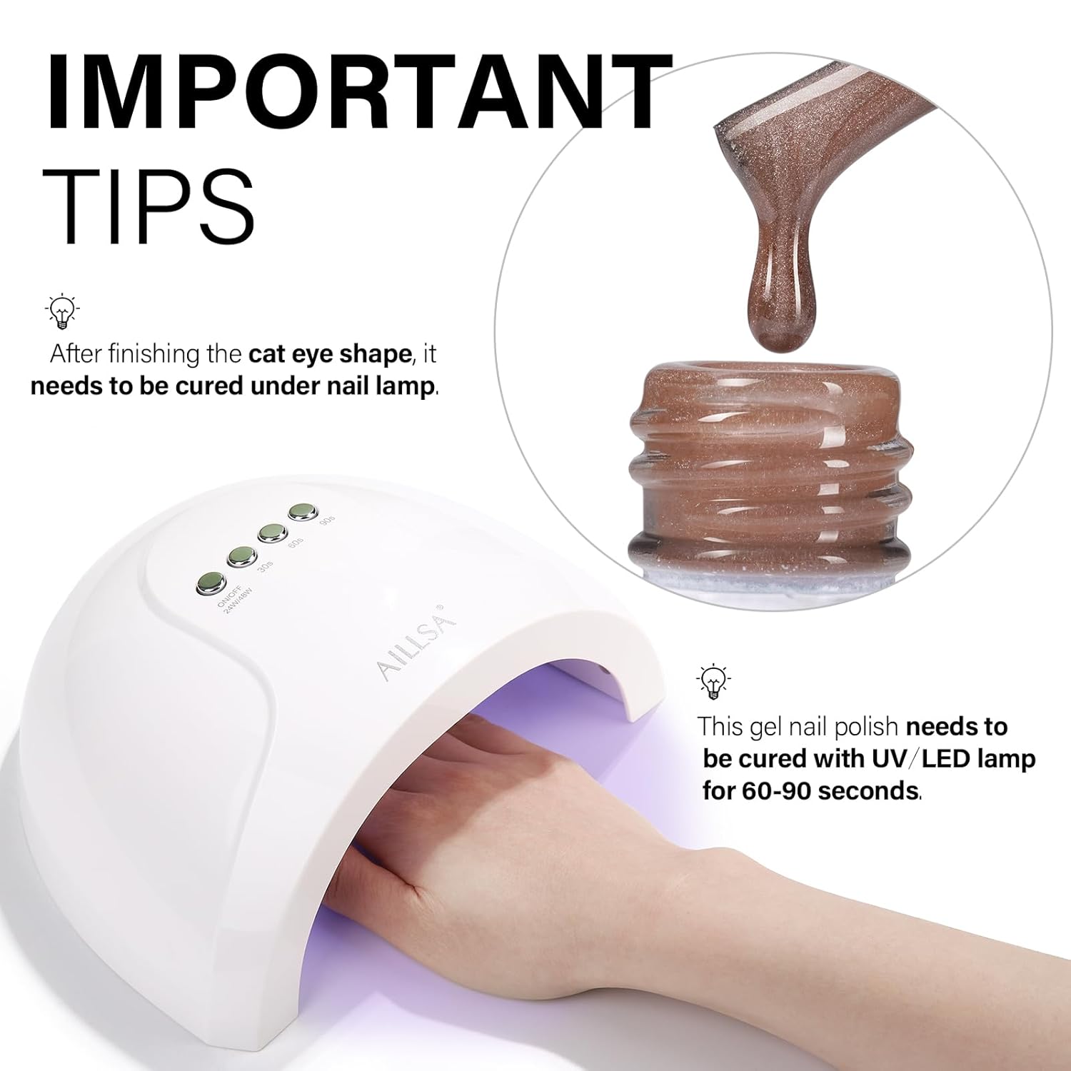 - CRYSTAL SPARKLING EFFECT - AILLSA Cat Eye Gel Nail Polish has a dense magnetic powder that can be used alone for a mirror-shimmering, crystal-clear manicure or with any base color nail polish, jelly gel nail polish, and other nail polishes.