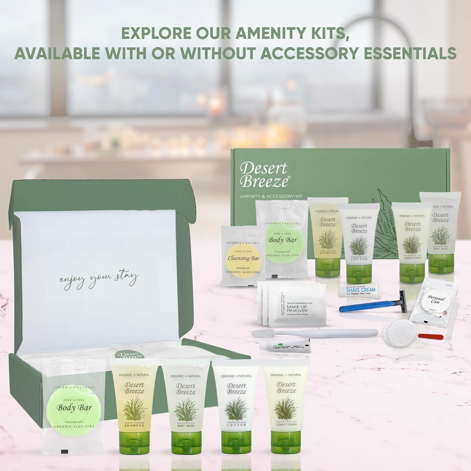 - WHY CHOOSE DESERT BREEZE? Our high-end formula & environmentally friendly beautiful design bring elegance to any upscale rental or vacation property. Our travel size, pump, and gallon toiletries are paraben-free, gluten-free & made with organic aloe, honey, & olive oil for soft skin & hair! We offer a range of products and cater to all your on-the-go personal care needs.