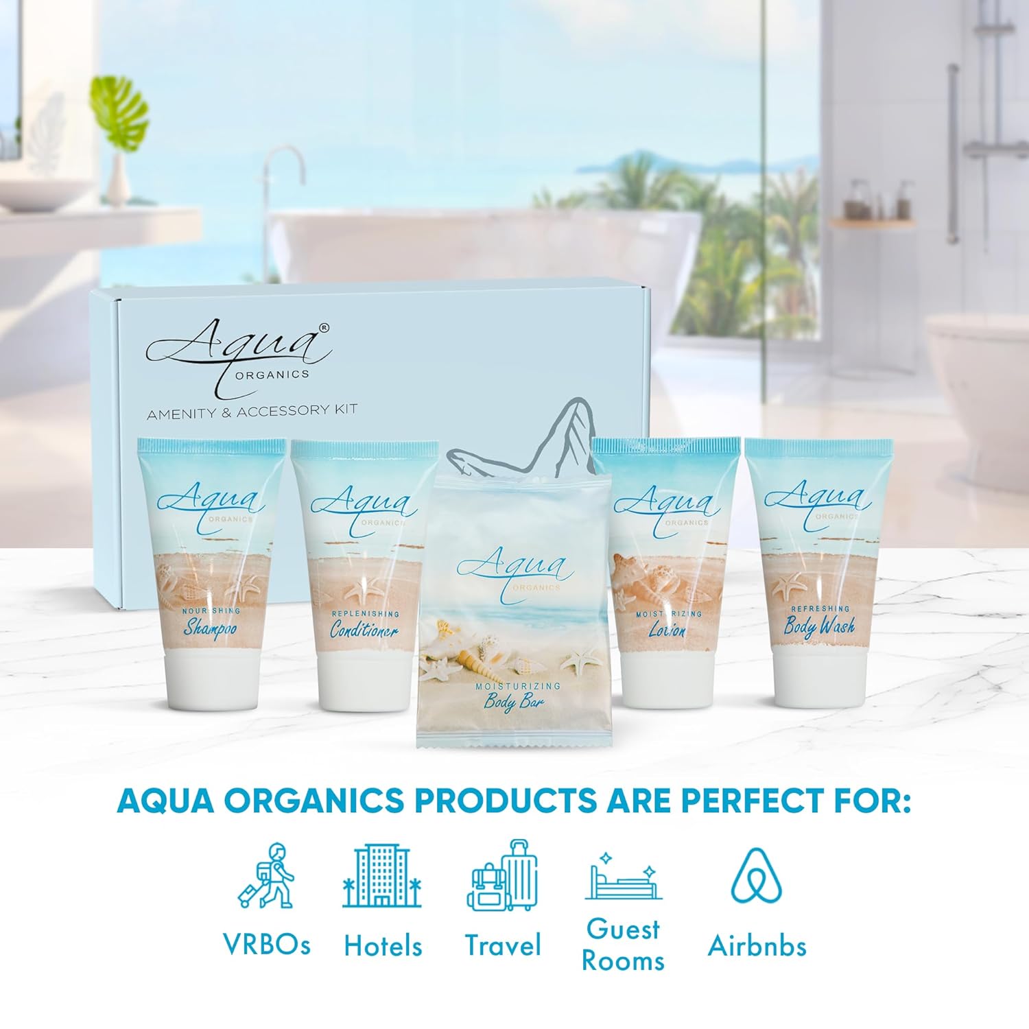 - WHY CHOOSE AQUA ORGANICS? Our high-end formula & environmentally friendly beautiful design bring elegance to any upscale rental or vacation property. Our travel size, pump, and gallon toiletries are paraben-free, gluten-free & made with organic aloe, honey, & olive oil for soft skin & hair! We offer a range of products and cater to all your on-the-go personal care needs.