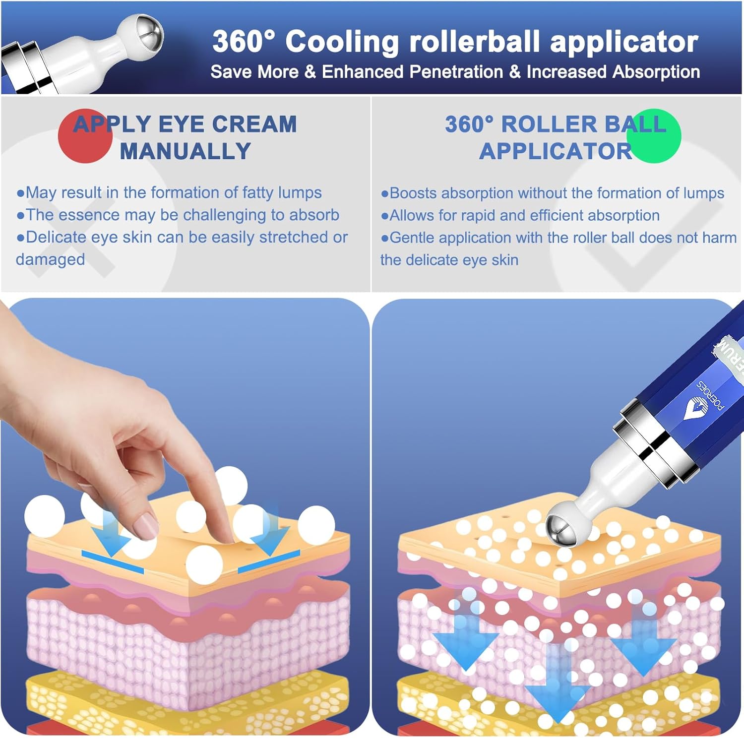 - The 360 degree eye roller massage ball helps stimulate circulation and drainage around the eye area for a brighter, more awakened look.