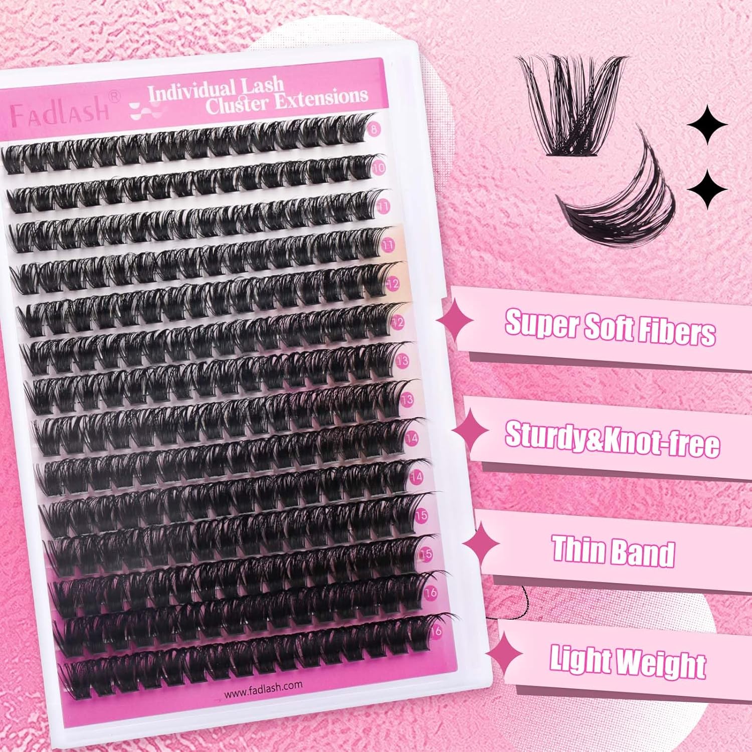 - Natural Lash Clusters: These soft cluster lashes with mixed length in one tray are convenient for you to use. Different lash styles can be created by yourself with our lash extensions clusters!