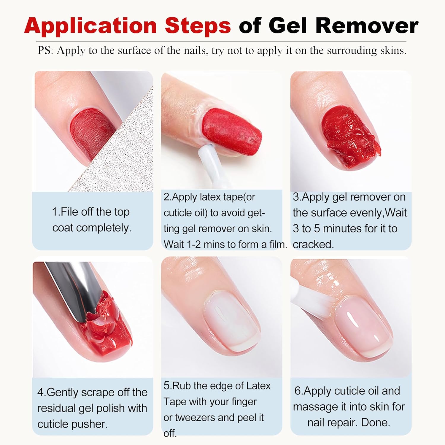 - 【Easy Removal Steps】1. Remove the topcoat with a nail file 2. Apply liquid latex on the skin around the nail (if any) 3. Apply gel remover and wait 3-5 minutes. Gel nail polish will burst and then it is easy to scrape off with the included tool. Note: For poly gel, dipping powder, building gel, acrylic powder, the effect is weakened, and it takes several more applications to achieve the removal effect.