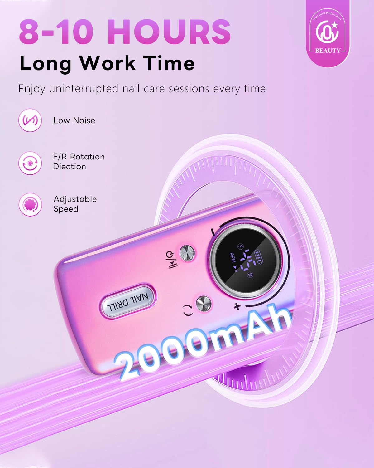 - 【8-10 Hours Long Work Time】Enjoy uninterrupted nail care sessions with our rechargeable nail drill, offering an impressive 8-10 hours of continuous operation on a single charge. Ideal for busy salon environments or long at-home nail treatments, ensuring consistent, reliable performance every time.