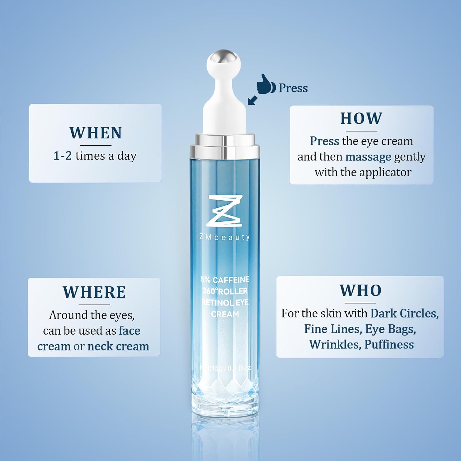 Under Eye Cream with 5% Caffeine, Dark Circles Under Eye Treatment with Retinol, Anti Aging Eye Serum with 360° Massage Roller for Eye Bags, Wrinkles and Puffiness, 0.5 fl. oz,3 Pack