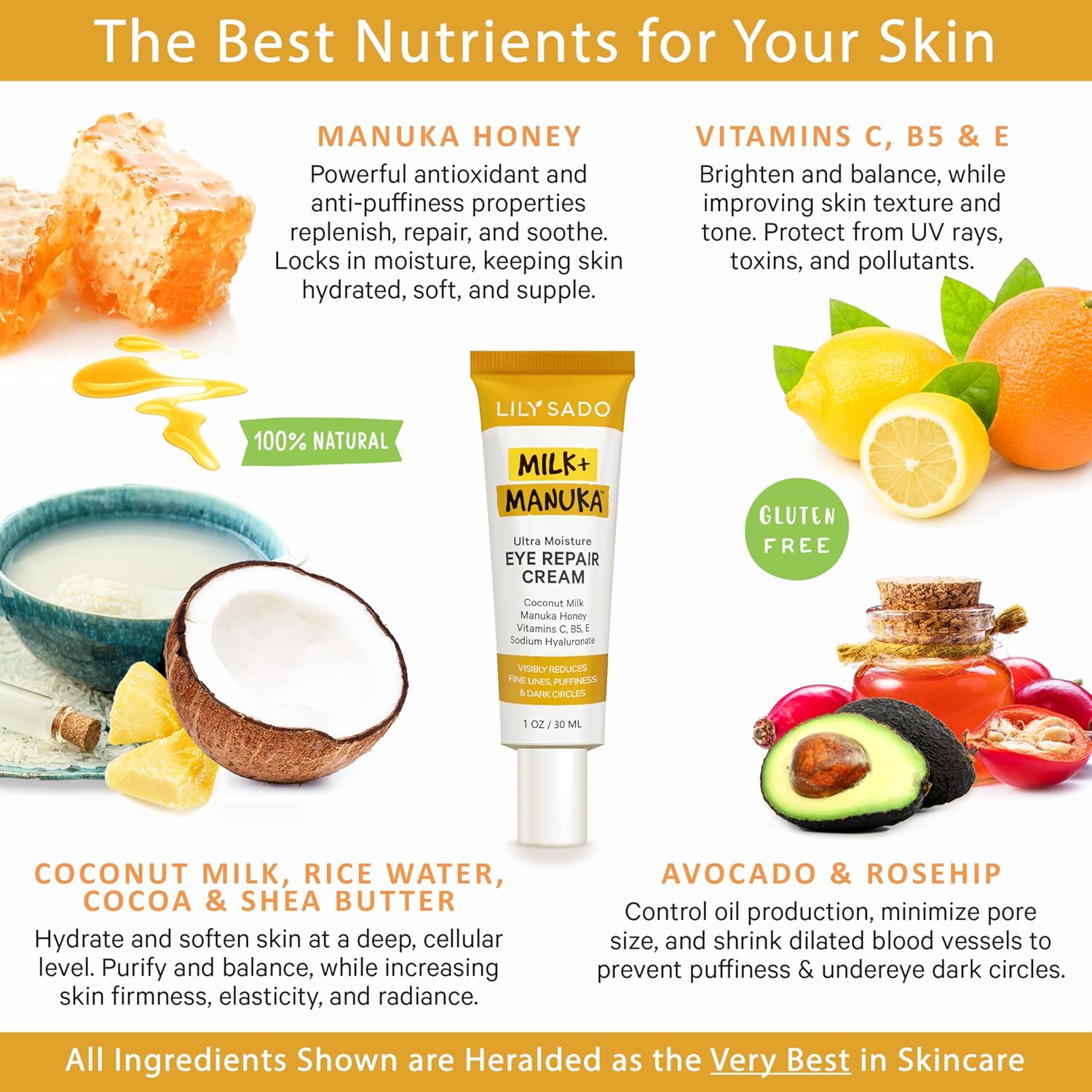 LILY SADO MILK+MANUKA™ Eye Repair Cream - Anti-Aging Natural Gentle Formula w/Coconut Milk, Manuka Honey, Sodium Hyaluronate & VITS C, B5 & E - Prevents Puffiness, Under-eye Wrinkles & Eye Bags - 1oz