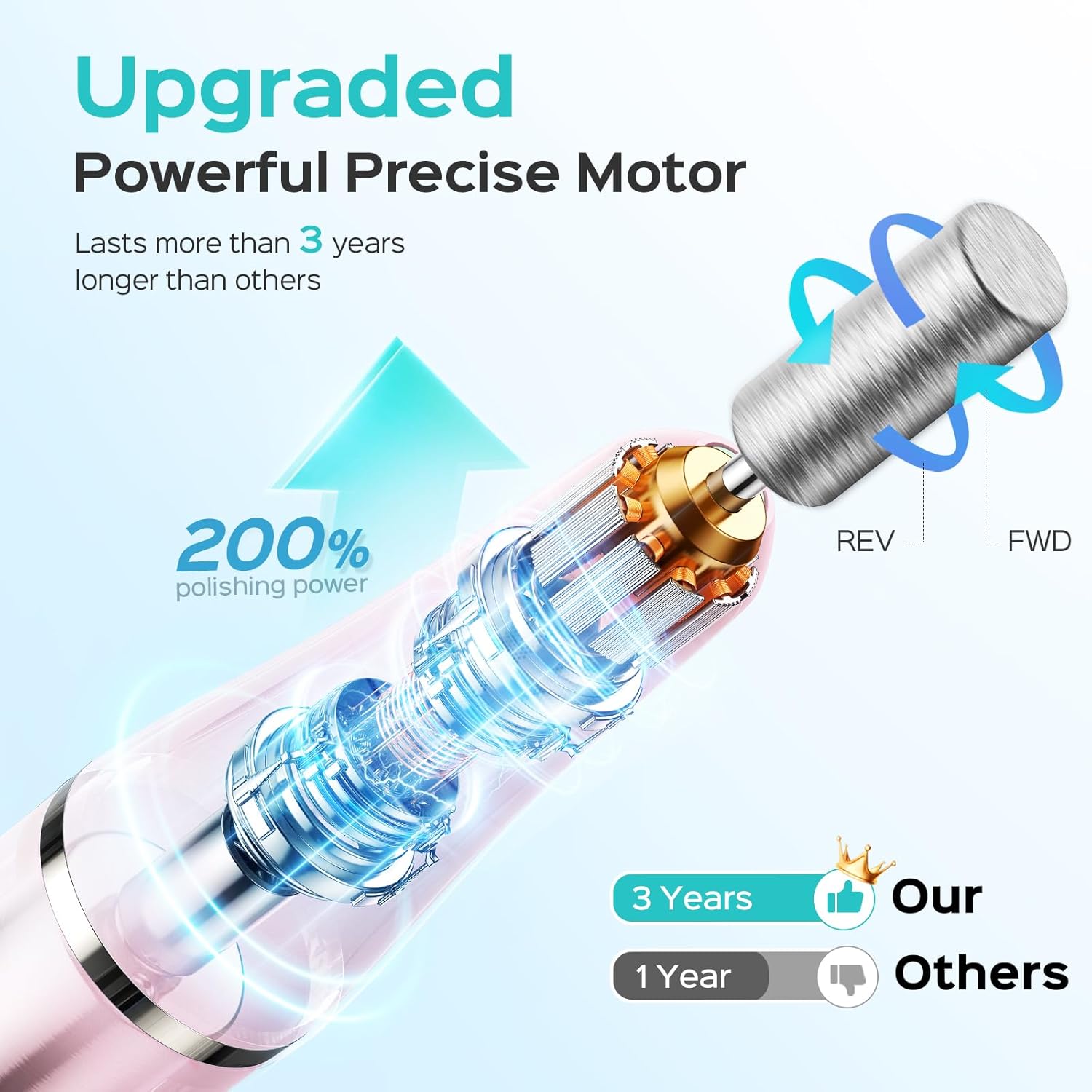 - 3 Years More Durable: The upgraded nail file set has a service life of more than 3 years, polishing efficiency increased by 200%.More powerful motor and shock-absorbing bearings, making it more durable, low vibration, low heat and low noise (<40dB), improving the comfort during use and making you fall in love with manicure.This nail file comes with a nail drill and grinding belt to meet your multiple manicure needs