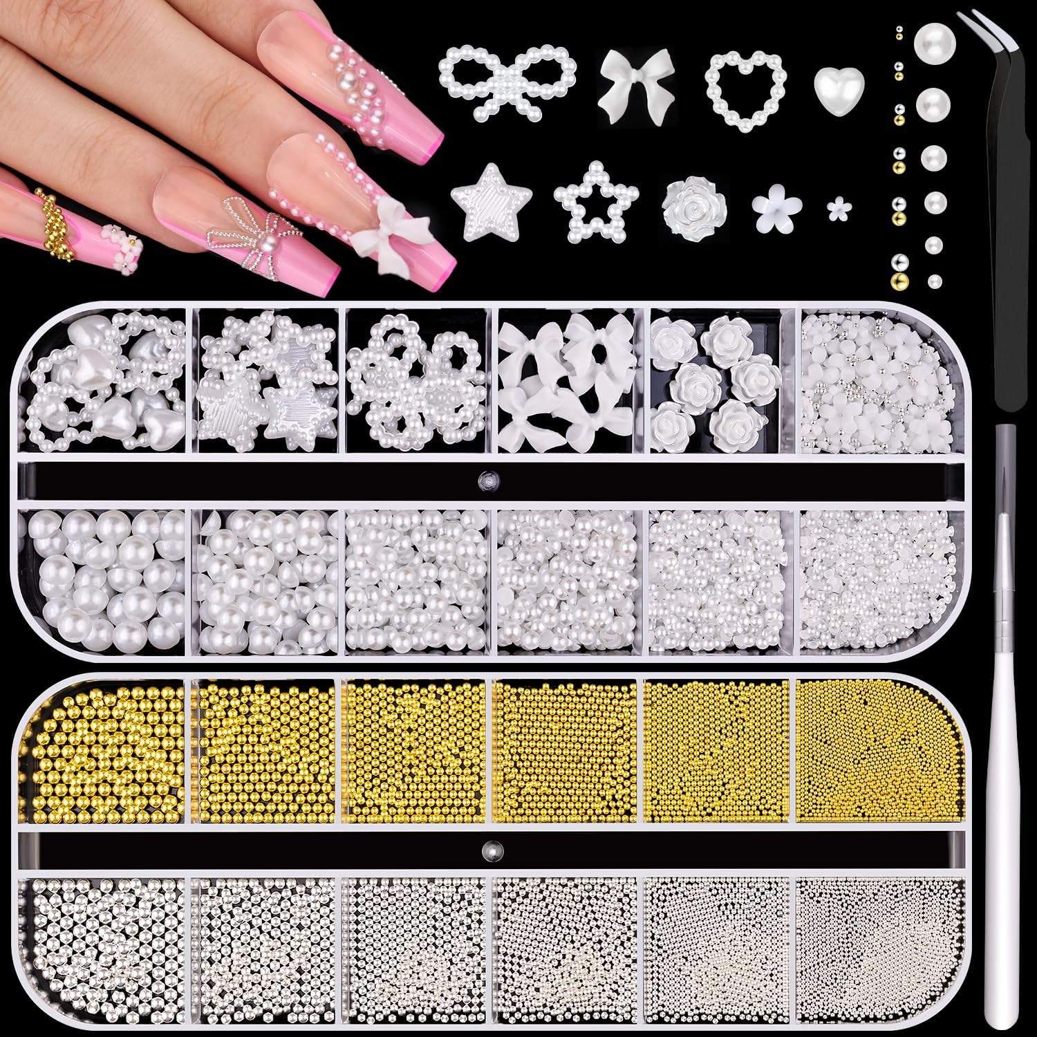 2 Boxes Flatback Pearls (White) and Metal Nail Beads (Silver+Gold) for Acrylic Nail Tips Manicure Decor