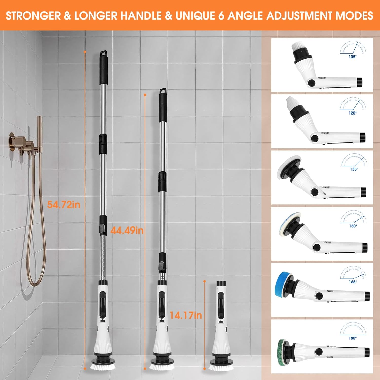 - 【Ergonomic Design & Extended Reach】This shower scrubber with long handle features lightweight stainless steel frame, allowing effortless cleaning of ceiling corners and behind toilets without bending. The 6 Adjustable Angles on this bathroom scrubber electric adapts to angled surfaces like shower doors and baseboards, It is also very easy to change the brush head during the cleaning process.