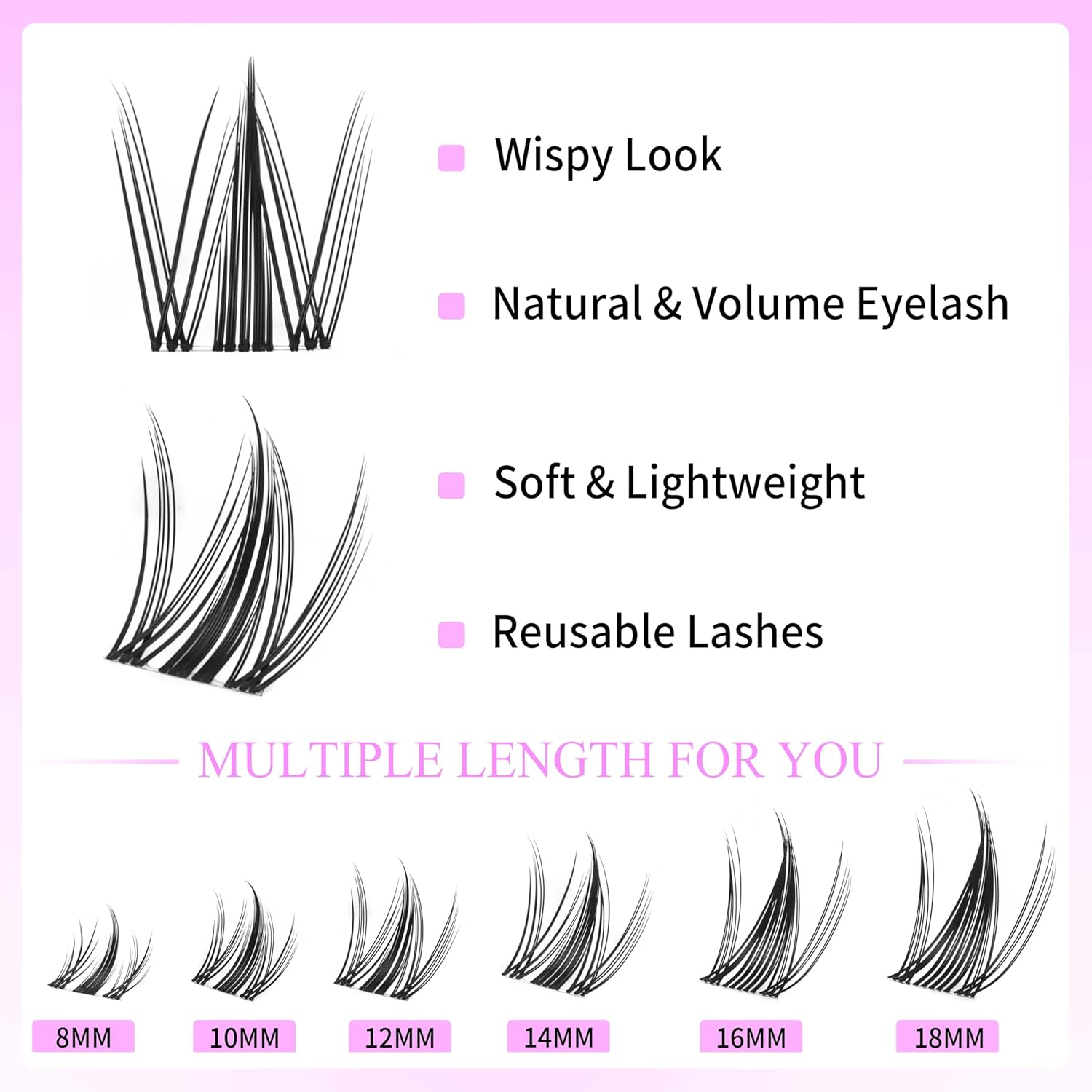 VEYESBEAUTY Lash Clusters Eyelash Extensions Thin & Invisible Band DIY Individual False Eyelashes Newbie's Five-Second Series Wispy Lash Tray for Self-application, Manga Lashes 8-18mm Mixed Length