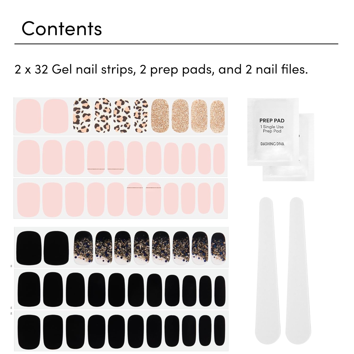 - Includes: 2 x Gel Strip Sets. Each set includes 32 gel manicure strips (20 base color, 12 accent), 1 prep pad, 1 nail file. Easily remove nail strips with nail oil or acetone