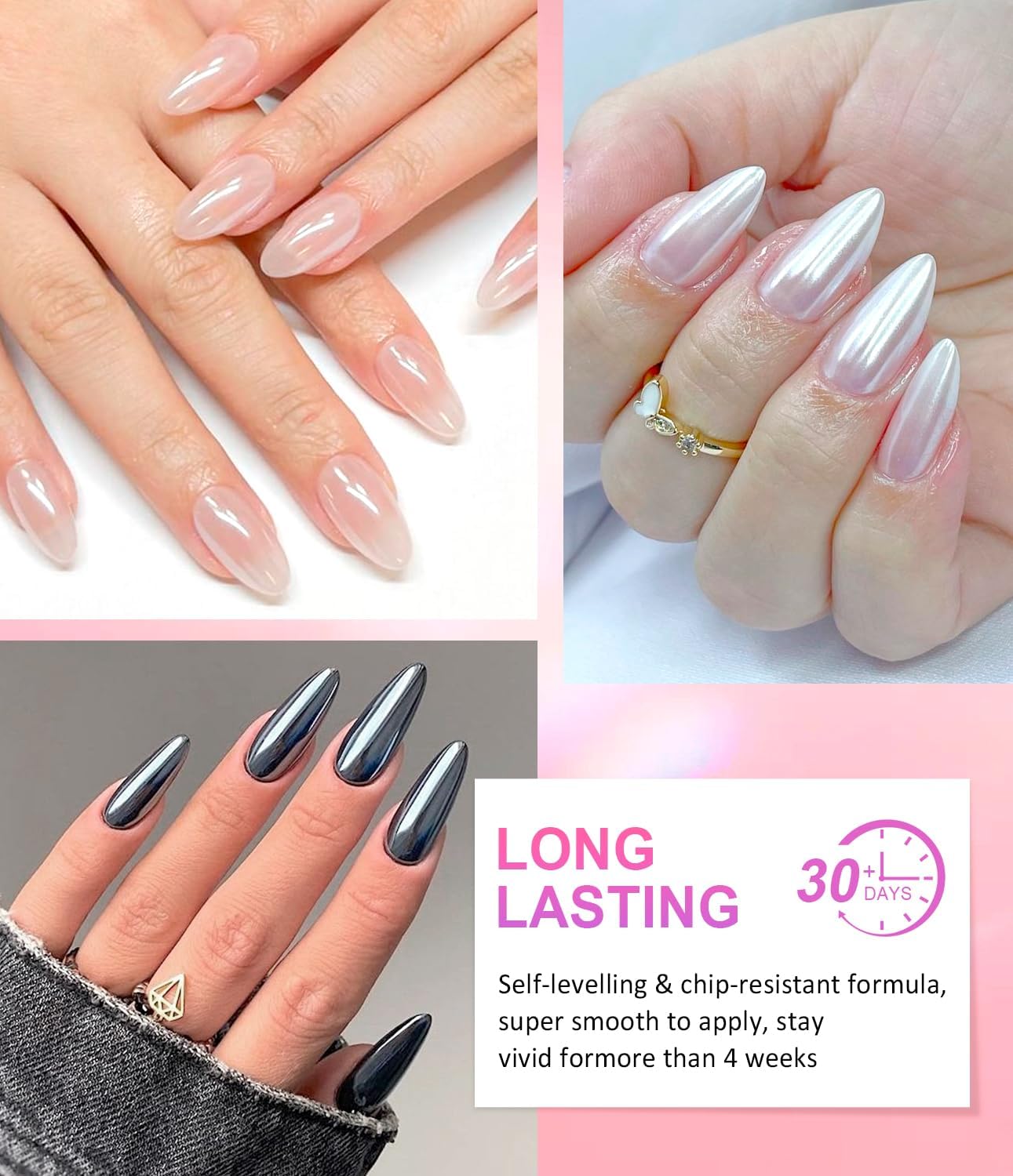 - Metallic Mirror Finish: Our chrome nail powder has sparkle and super mirror effect, like mirror-like metallic texture! It makes your nails look glittery, show elegant and stunning, like a "fairy" thanks to its astonishing chrome effect. And this glittery effect lasts for more than 28+ days.
