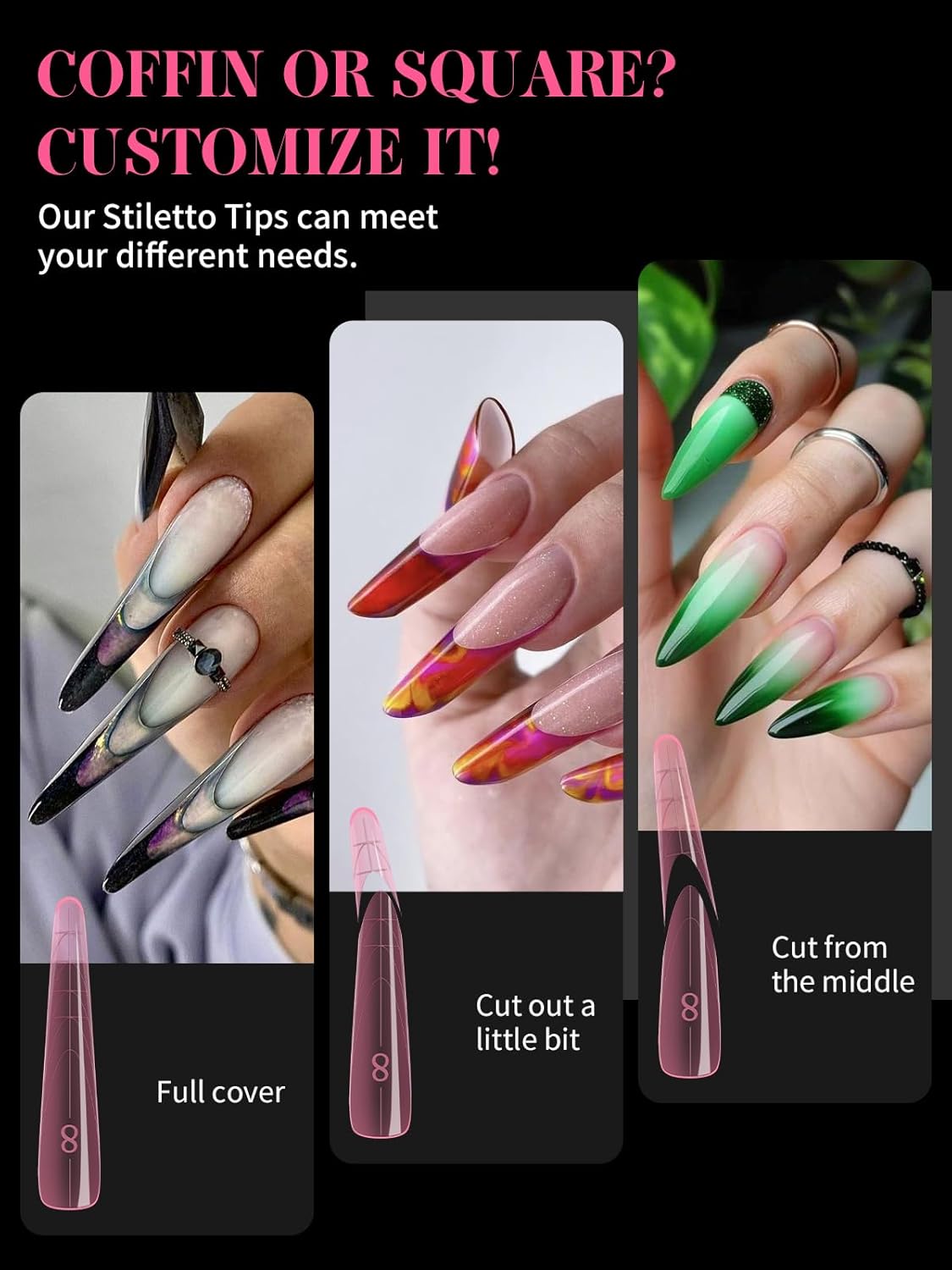 - 【Nail Form Mold with 15 Sizes】150pcs stiletto clear dual forms for poly nail gel offers 15 different nail sizes , and each size of long nail tips is separated by a small grid, a total of 15 grids, so they're easy and convenient to choose the suitable size to meet your nail's need.