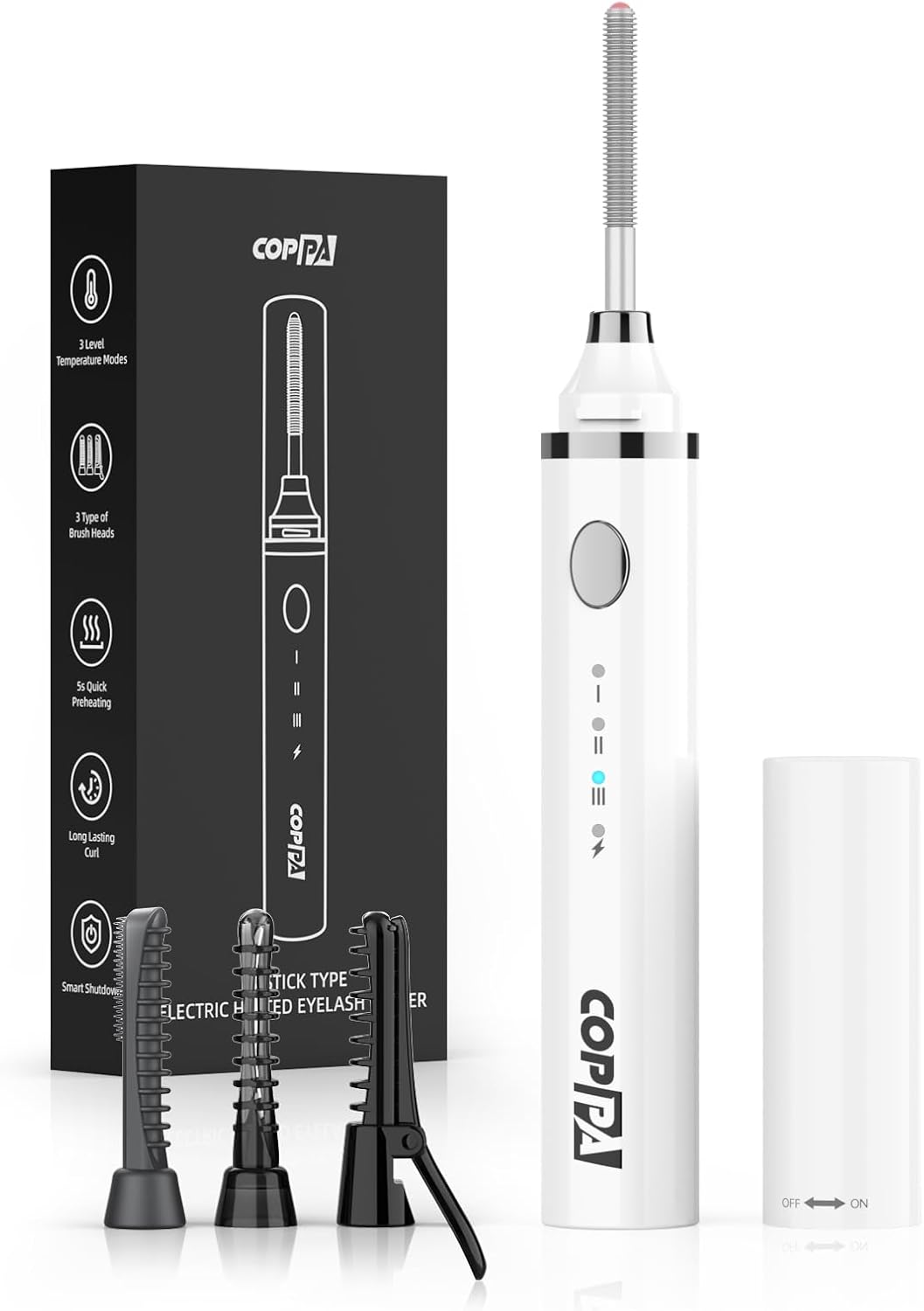 COPPA Electric Lash Curler, LP-1 Lipstick Type 3-in-1 Heated Eyelash Curler with 3 Brush Heads 3 Curling Modes and 3 Temp & 5s Quick Heat-up, Perfect for Beginners and Makeup Pros, White