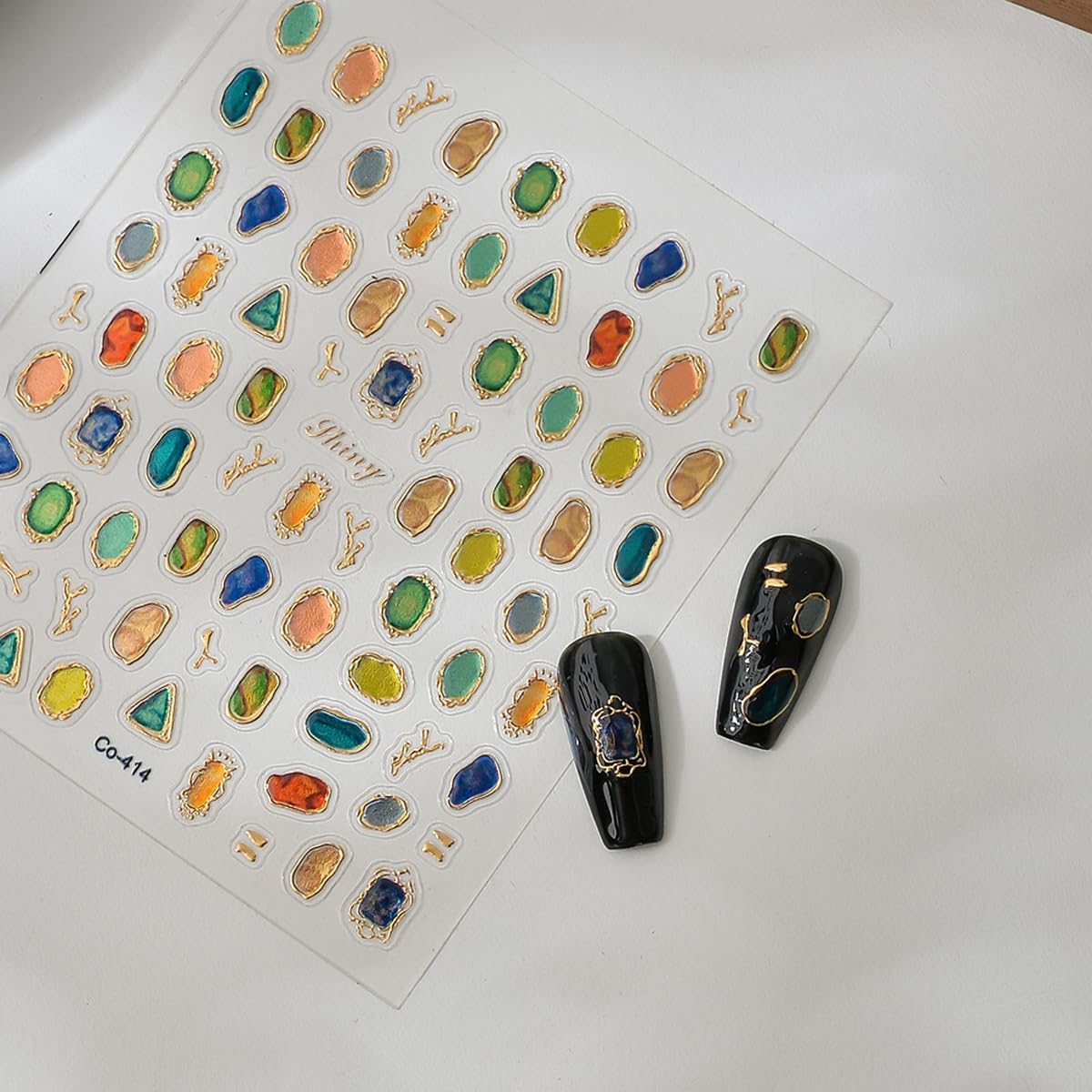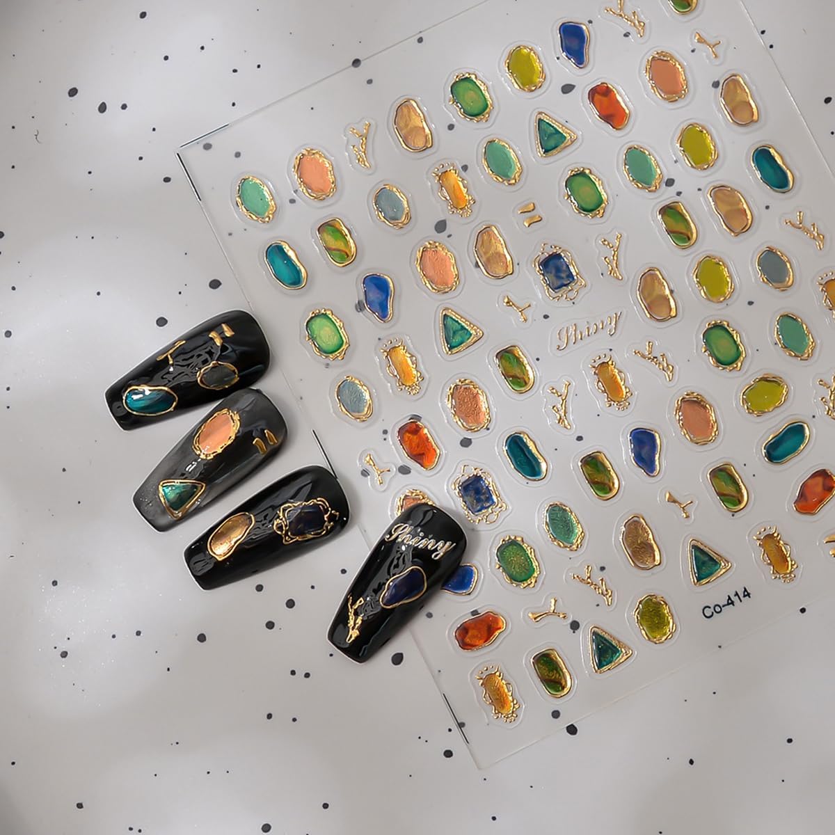 - Shiny Gems Design: Elevate your nail game with our gold nail stickers featuring colorful gems.The gold-trimmed borders add a touch a of elegance,perfect for creating luxury nail art